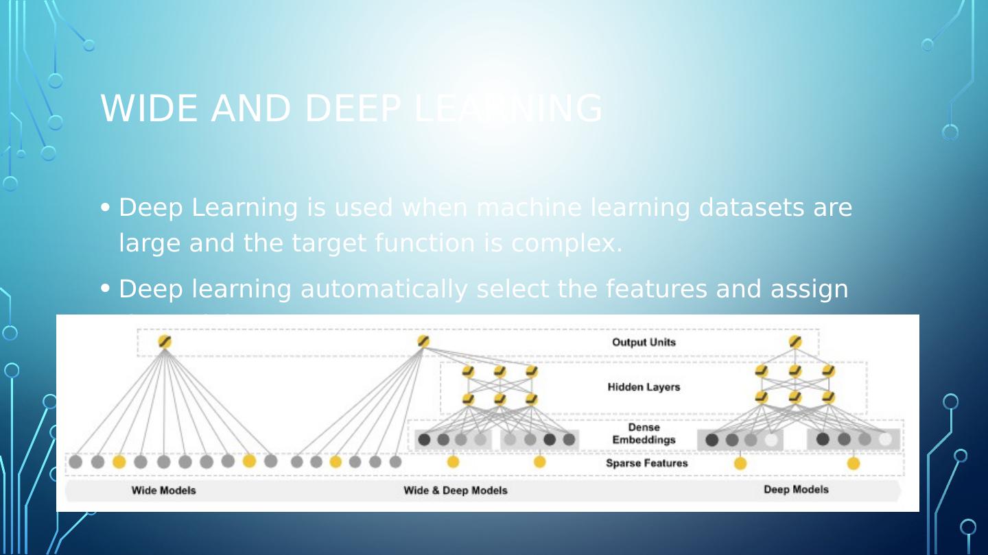 7 .Wide and deep learning Deep Learning is used when machine learning datasets are large and the target function is complex. Deep learning automatically select the features and assign the weights.