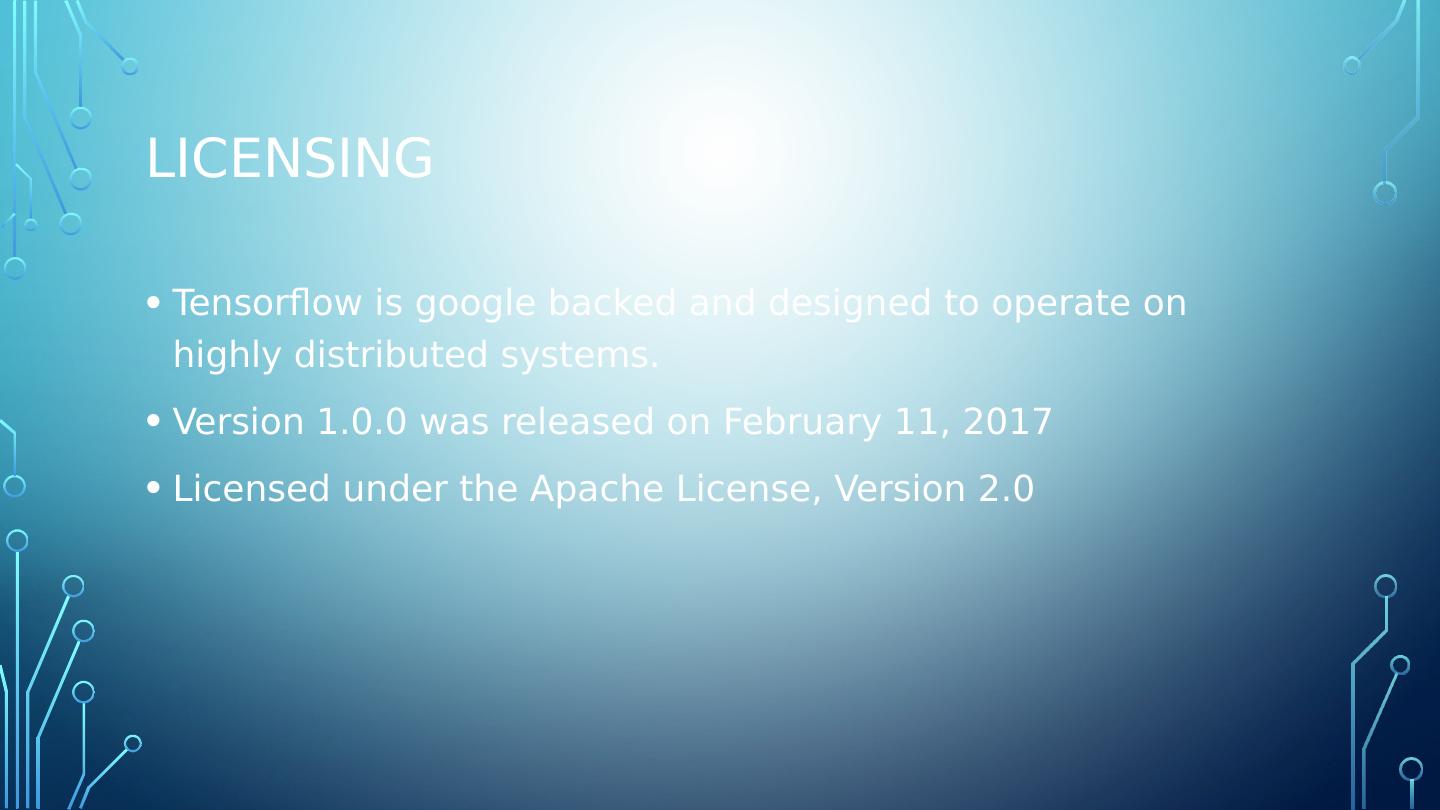 9 .licensing Tensorflow is google backed and designed to operate on highly distributed systems. Version 1.0.0 was released on February 11, 2017 Licensed under the Apache License, Version 2.0