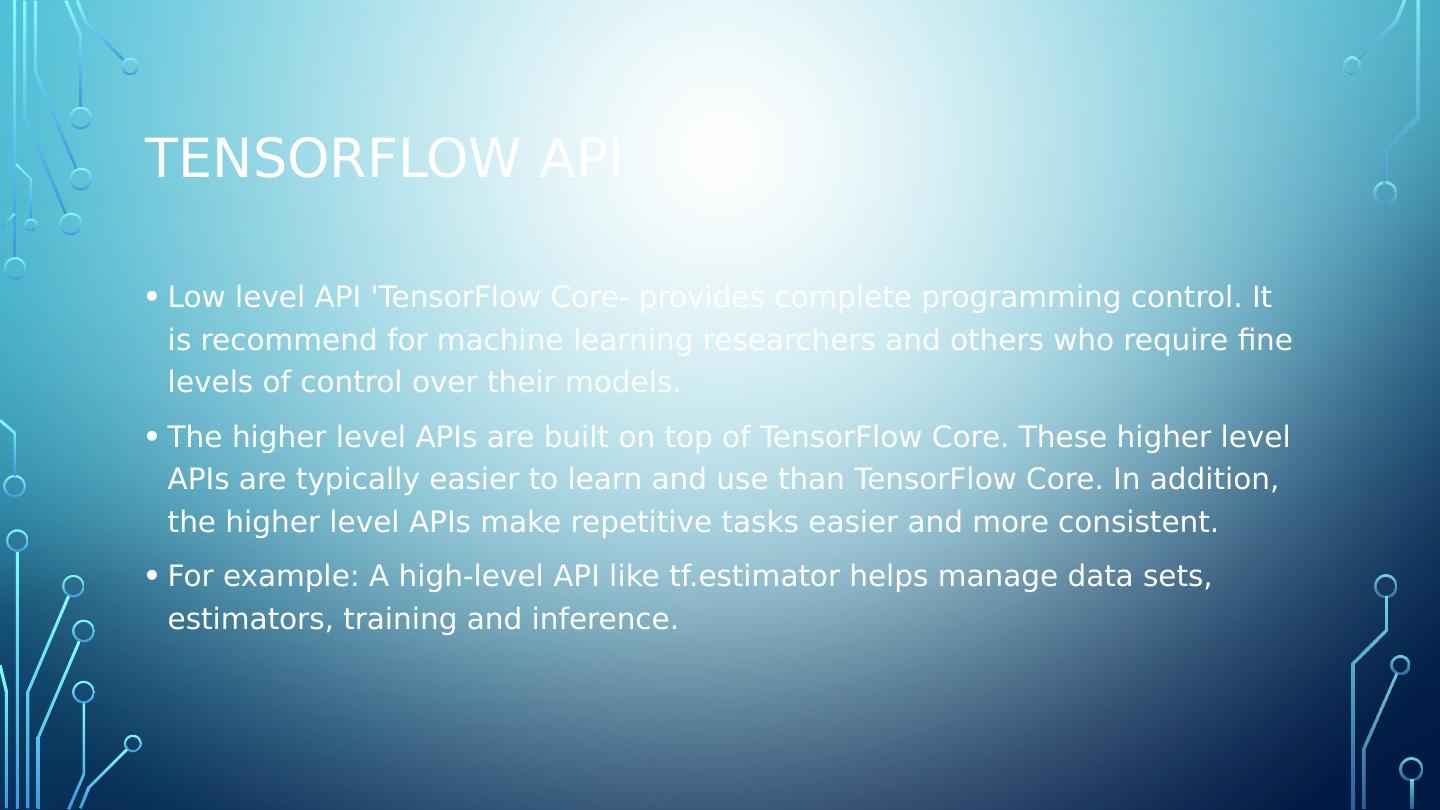 10 .Independent api on top of tensorflow Keras - a high-level neural networks API, written in Python and capable of running on top of TensorFlow , CNTK, or Theano. It was developed with a focus on enabling fast experimentation. Pretty Tensor - provides thin wrappers on Tensors so that you can easily build multi-layer neural networks.