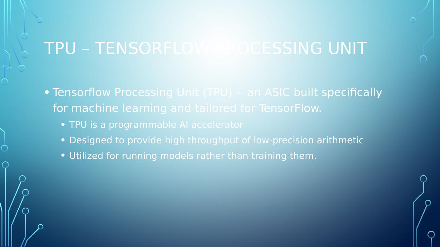 11 .Tpu – tensorflow processing unit Tensorflow Processing Unit (TPU) -- an ASIC built specifically for machine learning and tailored for TensorFlow . TPU is a programmable AI accelerator Designed to provide high throughput of low-precision arithmetic Utilized for running models rather than training them.