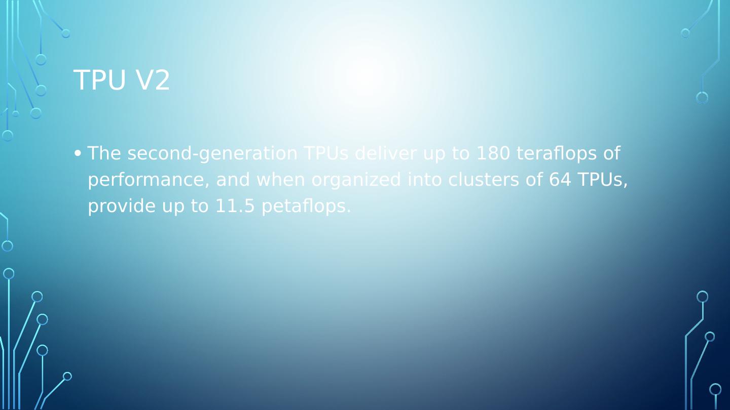12 .Tpu v2 The second-generation TPUs deliver up to 180 teraflops of performance, and when organized into clusters of 64 TPUs, provide up to 11.5 petaflops.