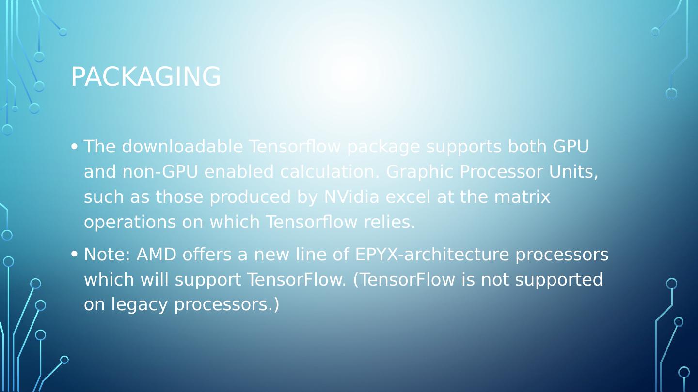 13 .packaging The downloadable Tensorflow package supports both GPU and non-GPU enabled calculation. Graphic Processor Units, such as those produced by NVidia excel at the matrix operations on which Tensorflow relies. Note: AMD offers a new line of EPYX-architecture processors which will support TensorFlow . ( TensorFlow is not supported on legacy processors.)