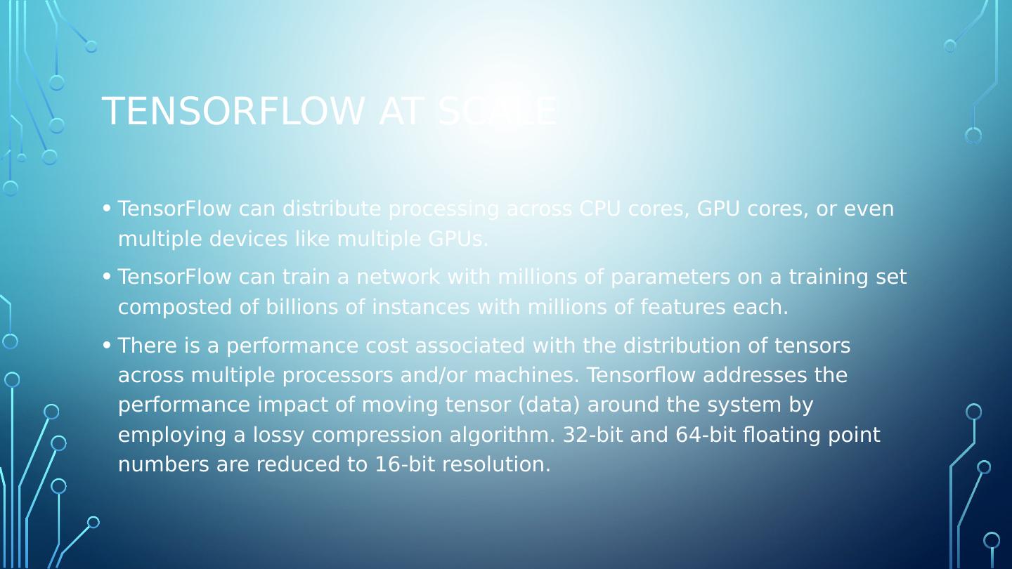 15 .Tensorflow at scale TensorFlow can distribute processing across CPU cores, GPU cores, or even multiple devices like multiple GPUs. TensorFlow can train a network with millions of parameters on a training set composted of billions of instances with millions of features each. There is a performance cost associated with the distribution of tensors across multiple processors and/or machines. Tensorflow addresses the performance impact of moving tensor (data) around the system by employing a lossy compression algorithm. 32-bit and 64-bit floating point numbers are reduced to 16-bit resolution.