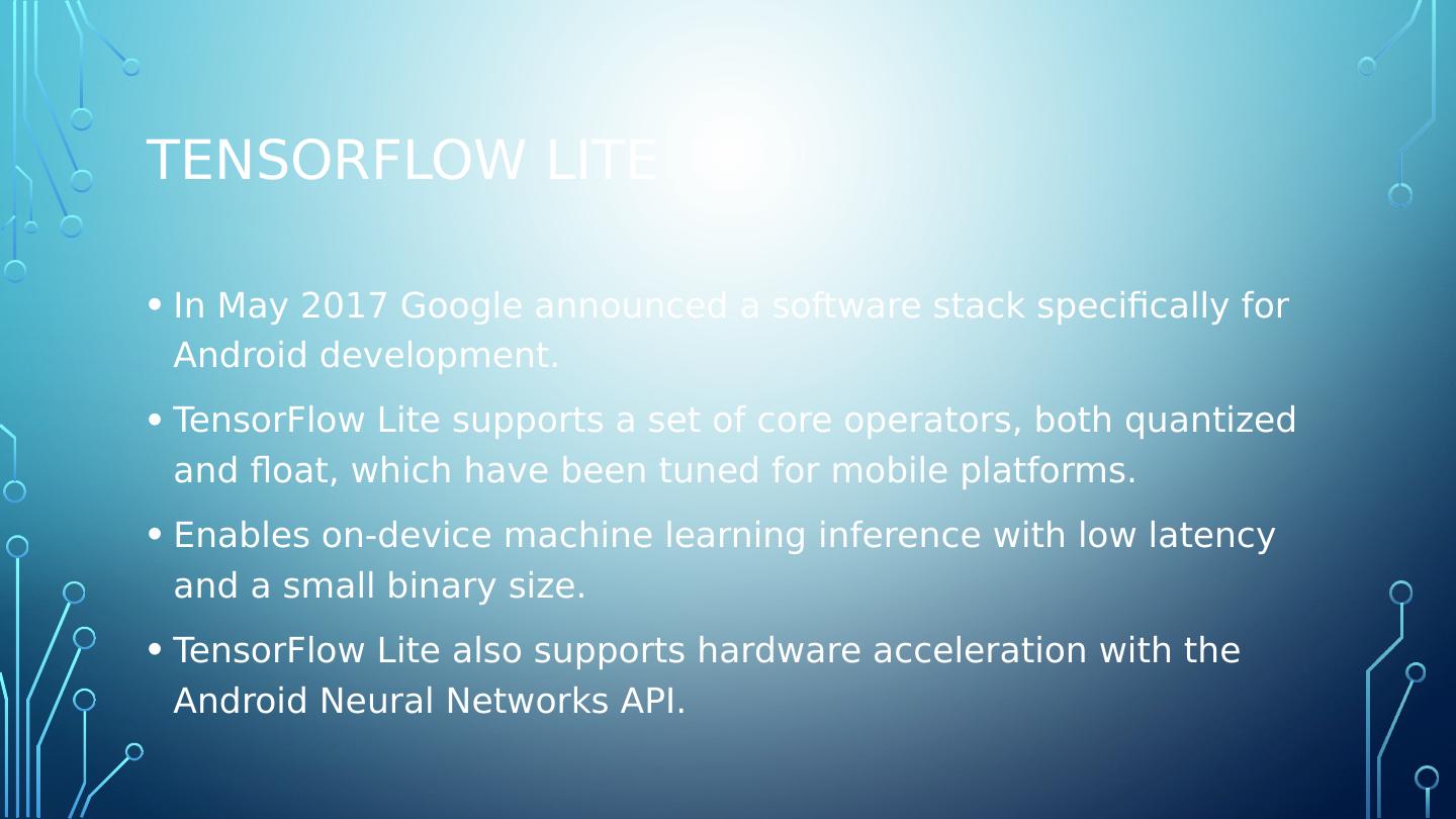 17 .Tensorflow lite In May 2017 Google announced a software stack specifically for Android development. TensorFlow Lite supports a set of core operators, both quantized and float, which have been tuned for mobile platforms. Enables on-device machine learning inference with low latency and a small binary size. TensorFlow Lite also supports hardware acceleration with the Android Neural Networks API.