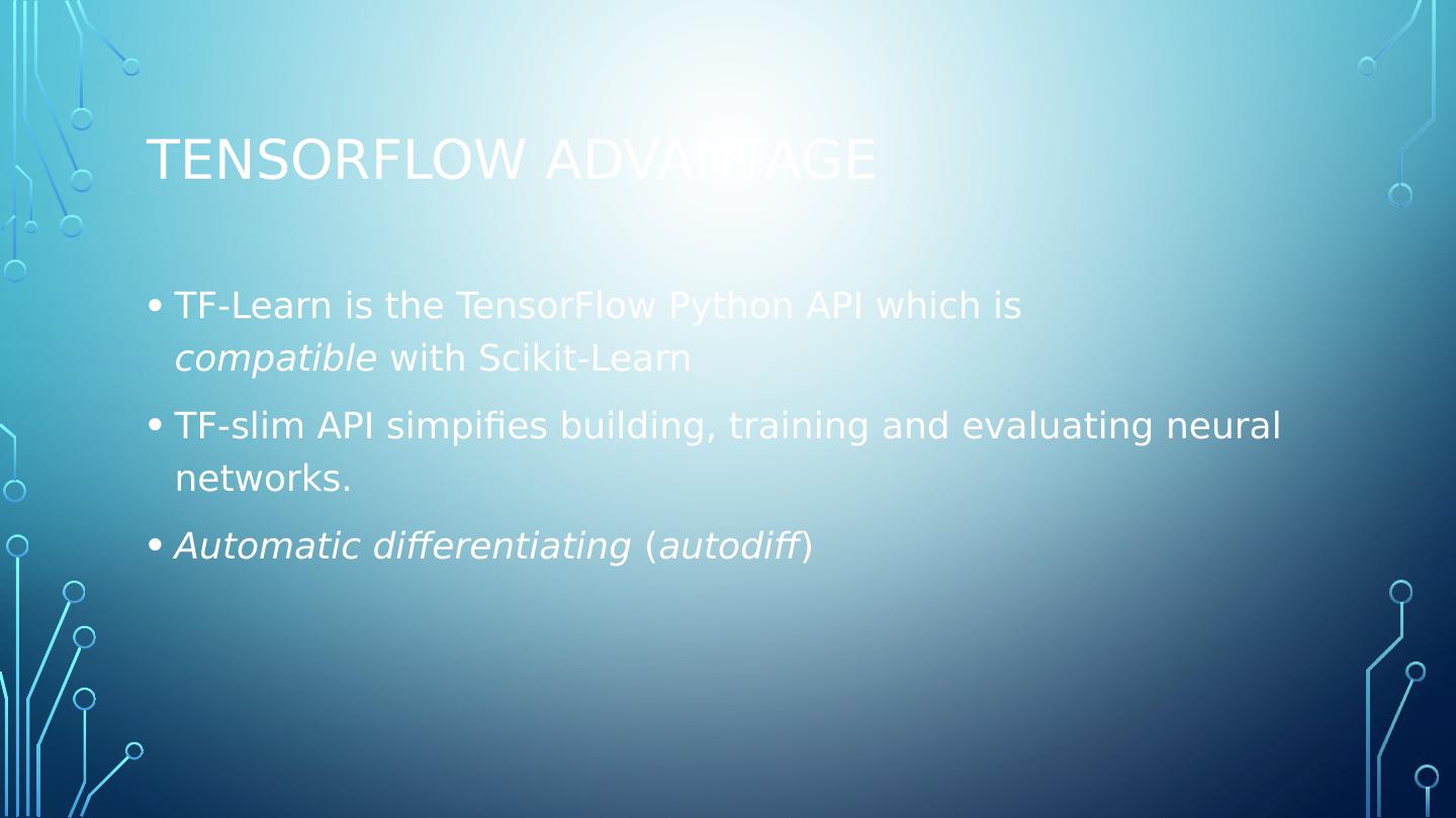 18 .Tensorflow advantage TF-Learn is the TensorFlow Python API which is compatible with Scikit -Learn TF-slim API simpifies building, training and evaluating neural networks. Automatic differentiating ( autodiff )