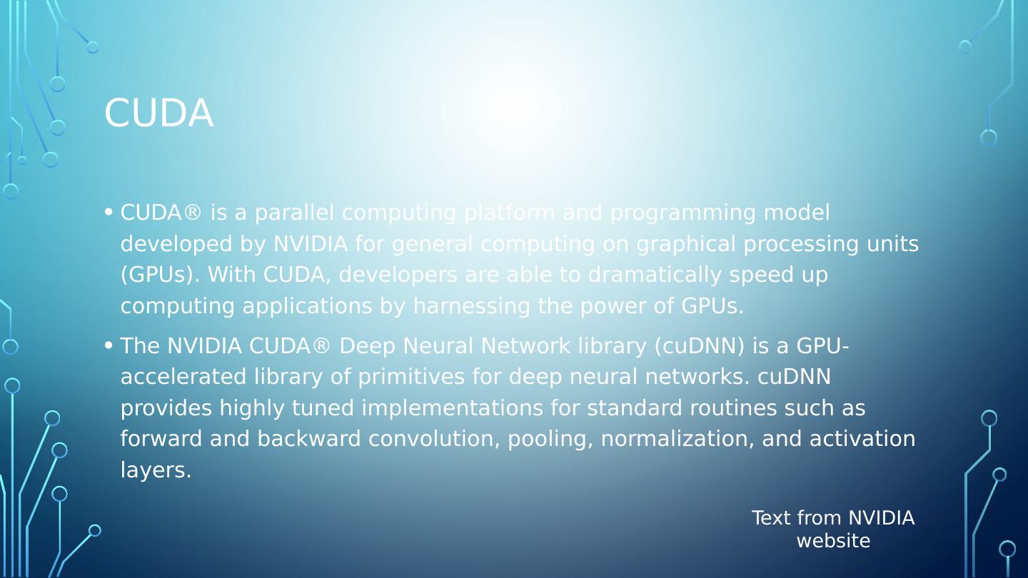 21 .cuda CUDA® is a parallel computing platform and programming model developed by NVIDIA for general computing on graphical processing units (GPUs). With CUDA, developers are able to dramatically speed up computing applications by harnessing the power of GPUs. The NVIDIA CUDA® Deep Neural Network library ( cuDNN ) is a GPU-accelerated library of primitives for deep neural networks. cuDNN provides highly tuned implementations for standard routines such as forward and backward convolution, pooling, normalization, and activation layers. Text from NVIDIA website