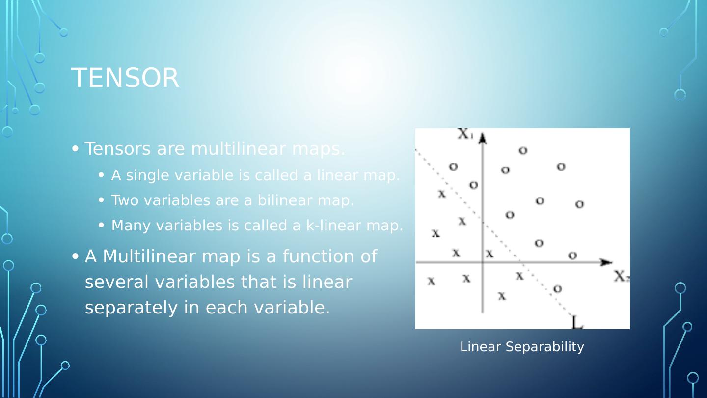 24 .tensor Tensors are multilinear maps. A single variable is called a linear map. Two variables are a bilinear map. Many variables is called a k-linear map. A Multilinear map is a function of several variables that is linear separately in each variable. Linear Separability
