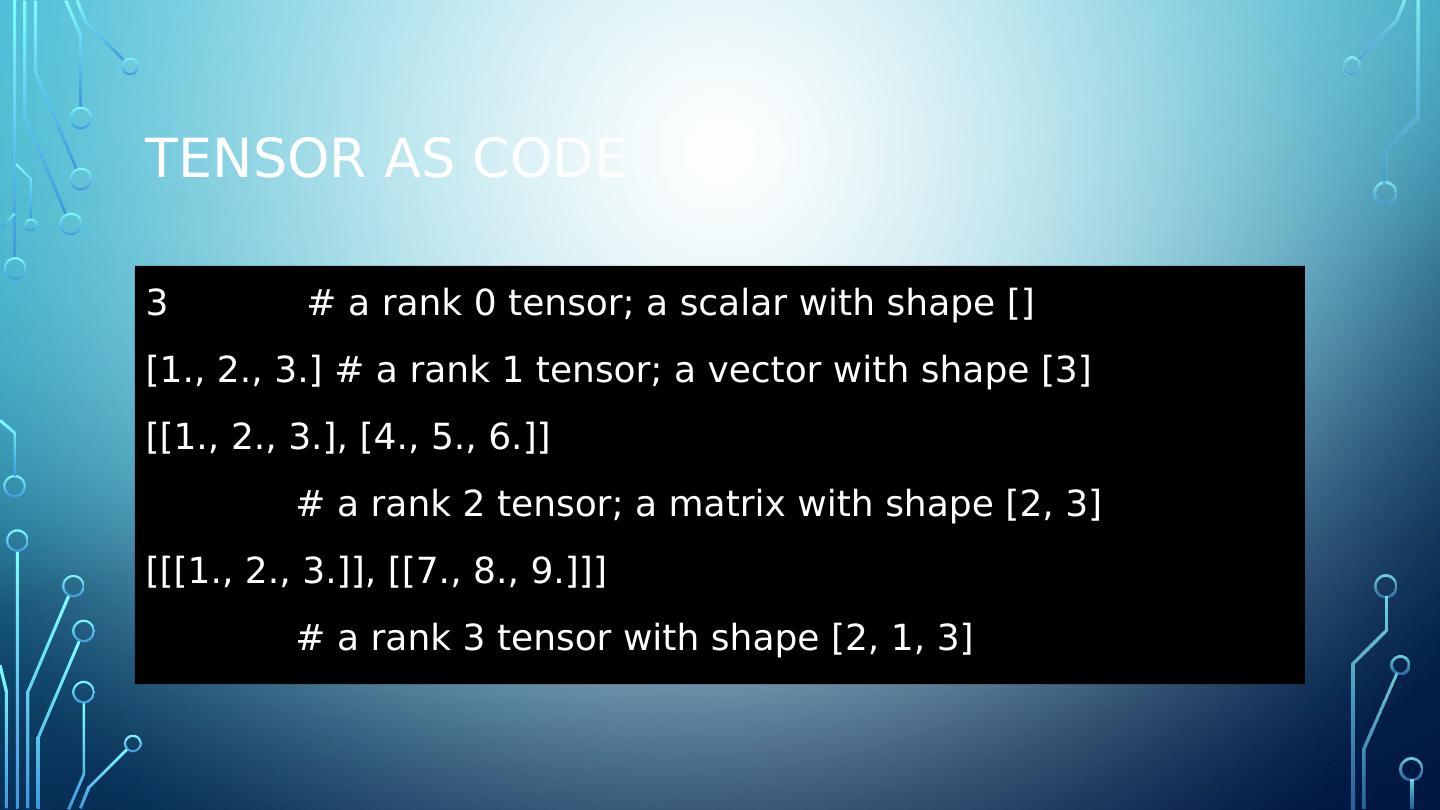 27 .Tensor as code 3 # a rank 0 tensor; a scalar with shape [] [1., 2., 3.] # a rank 1 tensor; a vector with shape [3] [[1., 2., 3.], [4., 5., 6.]] # a rank 2 tensor; a matrix with shape [2, 3] [[[1., 2., 3.]], [[7., 8., 9.]]] # a rank 3 tensor with shape [2, 1, 3]