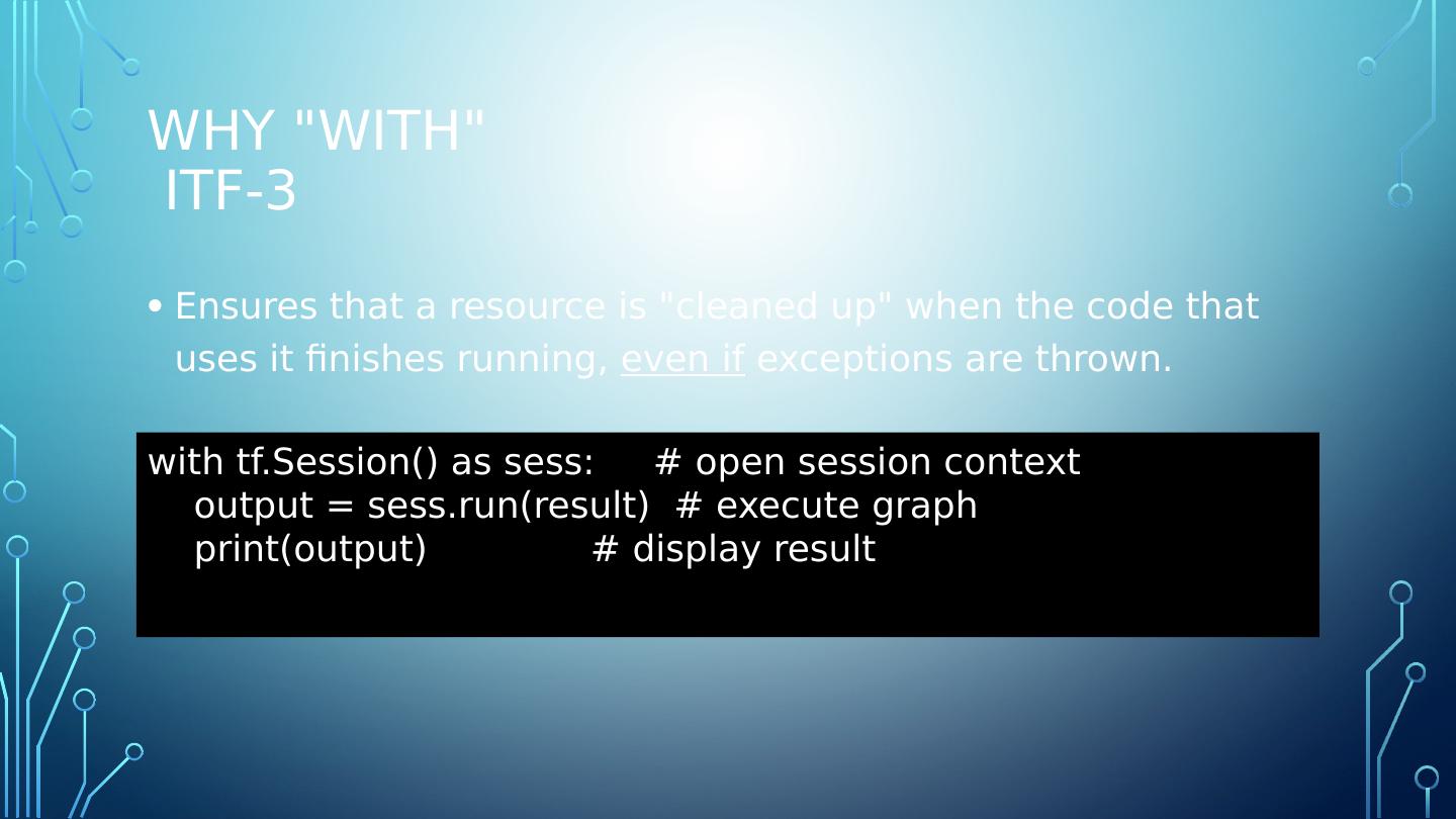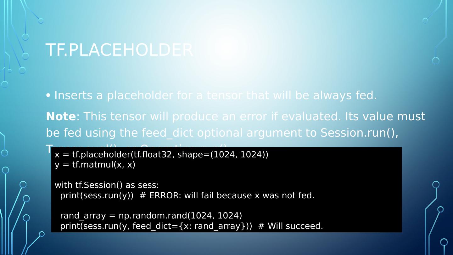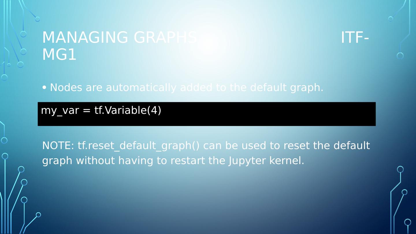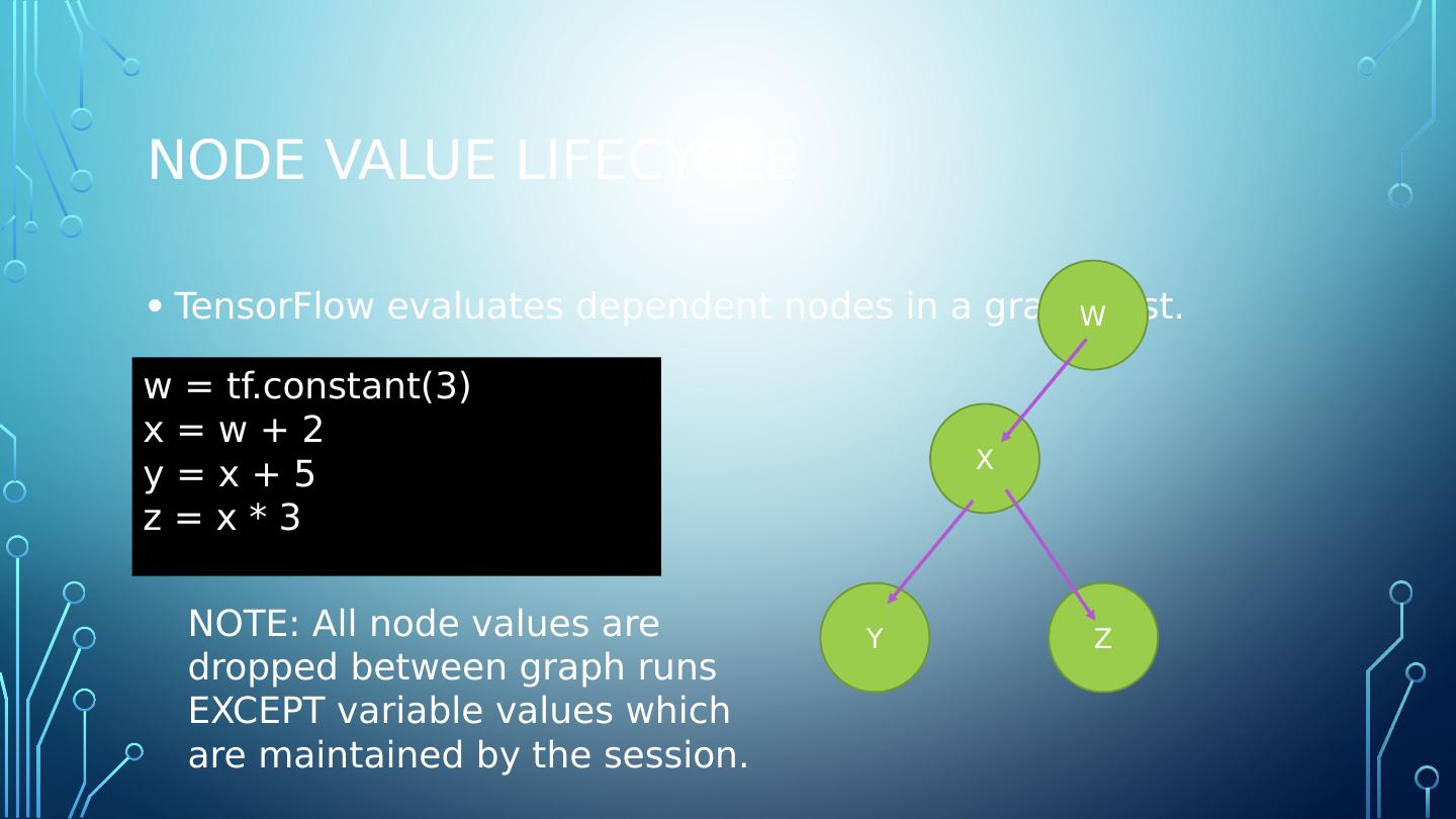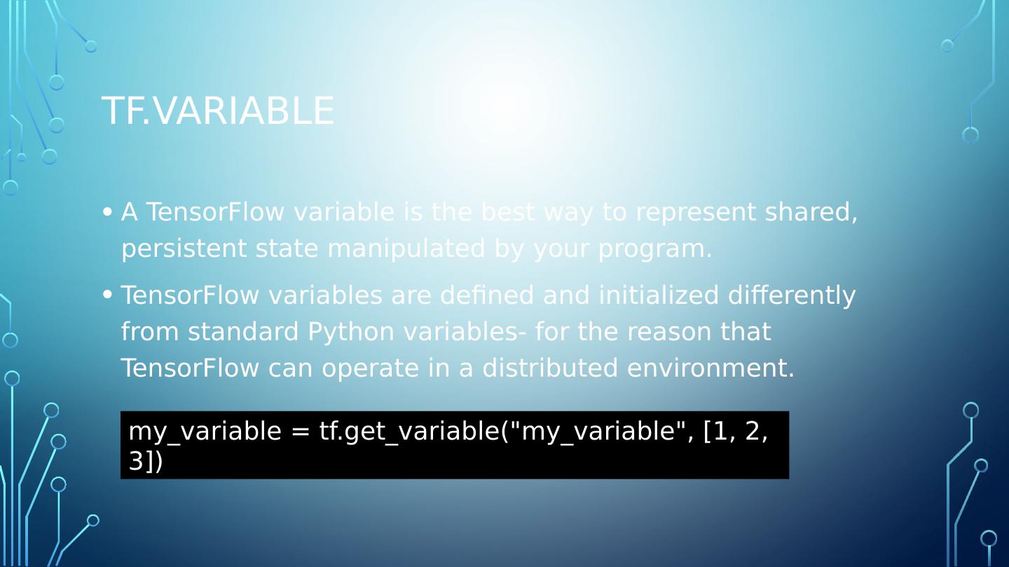 29 .Tf.Variable A TensorFlow variable is the best way to represent shared, persistent state manipulated by your program. TensorFlow variables are defined and initialized differently from standard Python variables- for the reason that TensorFlow can operate in a distributed environment. my_variable = tf.get_variable (" my_variable ", [1, 2, 3])