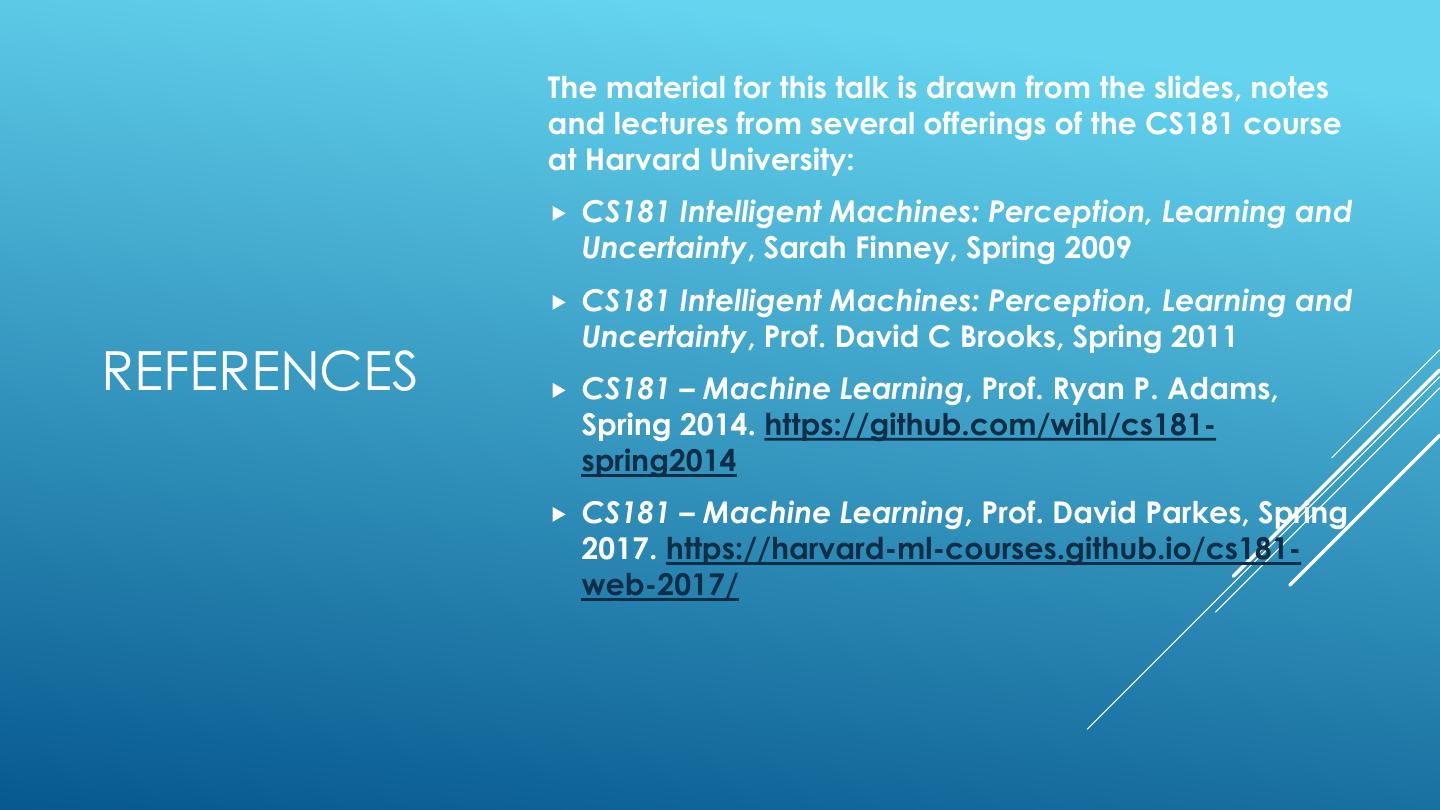 2 . The material for this talk is drawn from the slides, notes and lectures from several offerings of the CS181 course at Harvard University: CS181 Intelligent Machines: Perception, Learning and Uncertainty, Sarah Finney, Spring 2009 CS181 Intelligent Machines: Perception, Learning and Uncertainty, Prof. David C Brooks, Spring 2011 REFERENCES CS181 – Machine Learning, Prof. Ryan P. Adams, Spring 2014. https://github.com/wihl/cs181- spring2014 CS181 – Machine Learning, Prof. David Parkes, Spring 2017. https://harvard-ml-courses.github.io/cs181- web-2017/