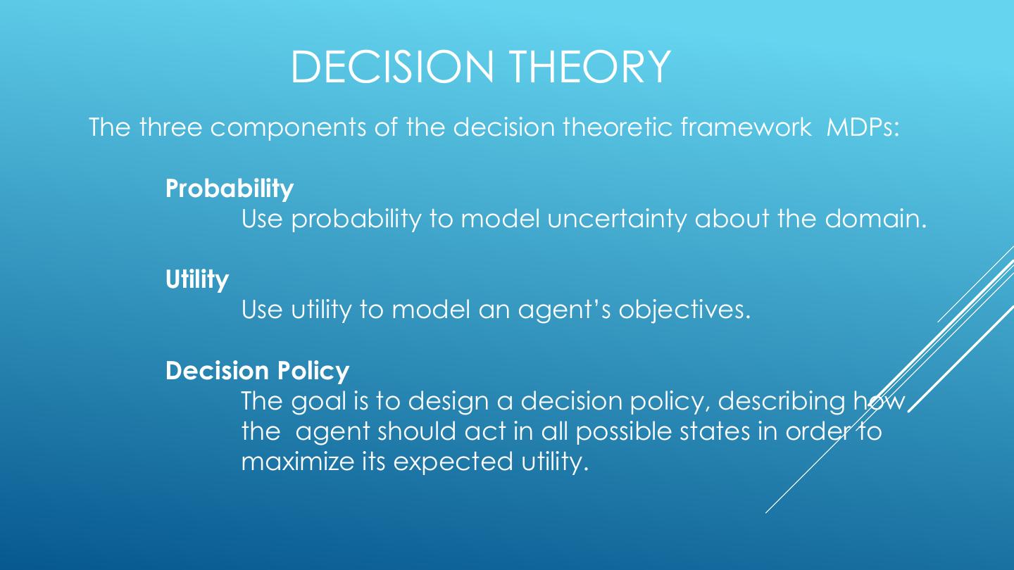 5 . DECISION THEORY The three components of the decision theoretic framework MDPs: Probability Use probability to model uncertainty about the domain. Utility Use utility to model an agent’s objectives. Decision Policy The goal is to design a decision policy, describing how the agent should act in all possible states in order to maximize its expected utility.