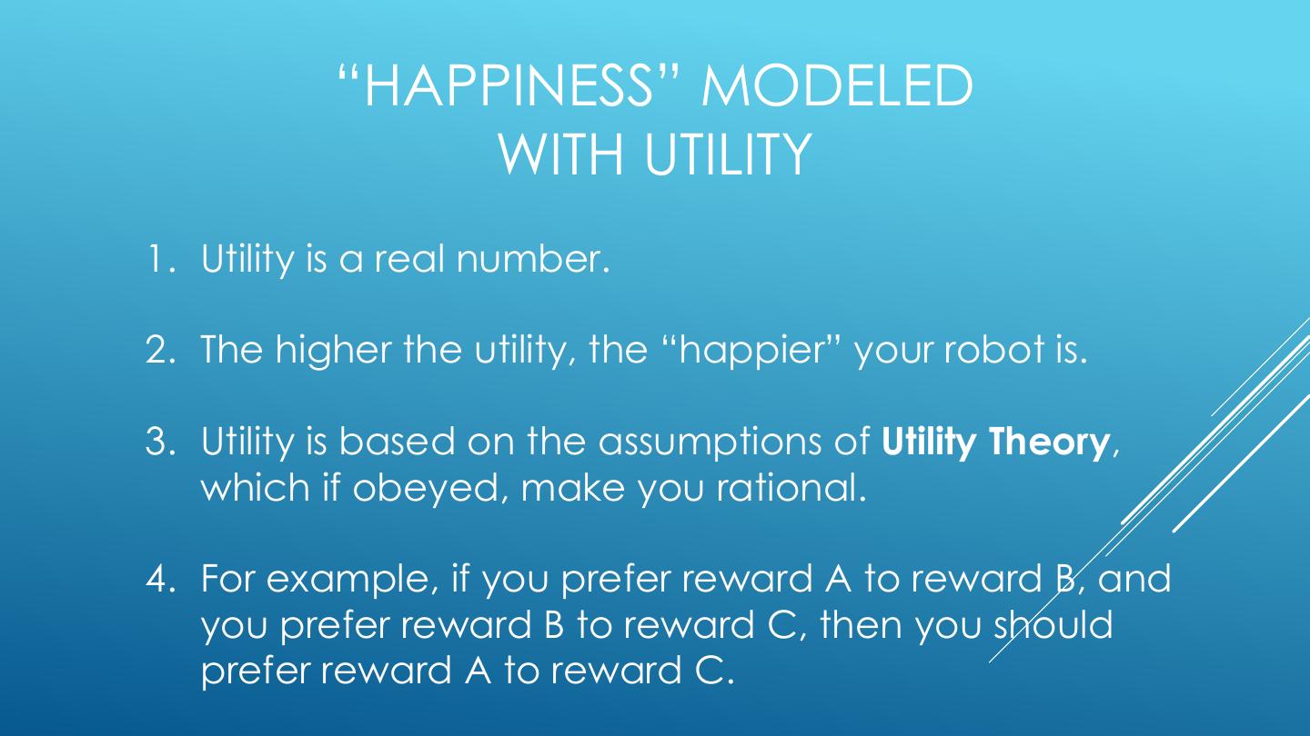 7 . “HAPPINESS” MODELED WITH UTILITY 1. Utility is a real number. 2. The higher the utility, the “happier” your robot is. 3. Utility is based on the assumptions of Utility Theory, which if obeyed, make you rational. 4. For example, if you prefer reward A to reward B, and you prefer reward B to reward C, then you should prefer reward A to reward C.