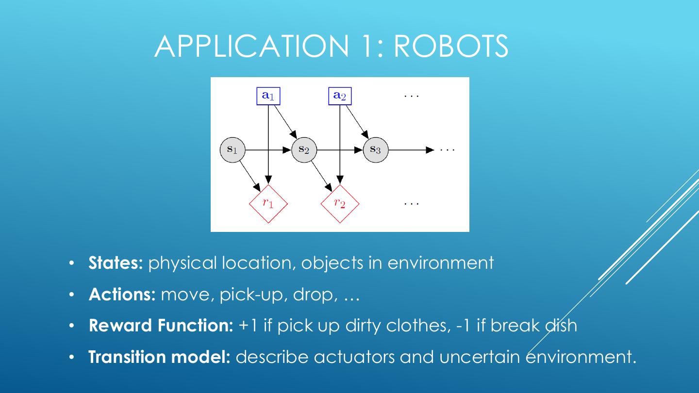10 . APPLICATION 1: ROBOTS • States: physical location, objects in environment • Actions: move, pick-up, drop, … • Reward Function: +1 if pick up dirty clothes, -1 if break dish • Transition model: describe actuators and uncertain environment.