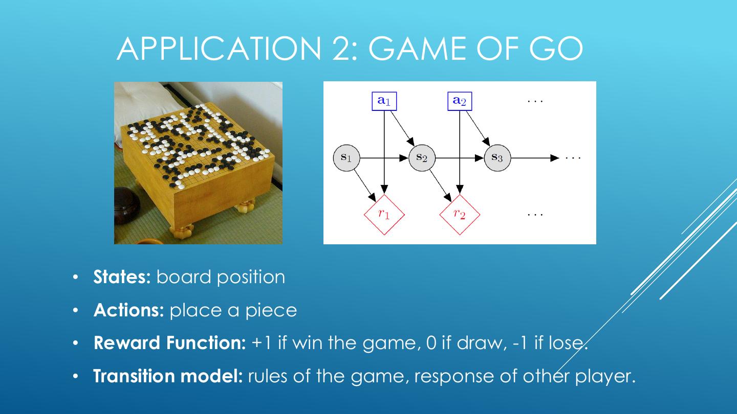 11 . APPLICATION 2: GAME OF GO • States: board position • Actions: place a piece • Reward Function: +1 if win the game, 0 if draw, -1 if lose. • Transition model: rules of the game, response of other player.