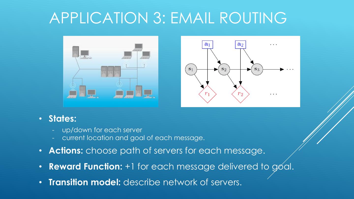 13 . APPLICATION 3: EMAIL ROUTING • States: - up/down for each server - current location and goal of each message. • Actions: choose path of servers for each message. • Reward Function: +1 for each message delivered to goal. • Transition model: describe network of servers.