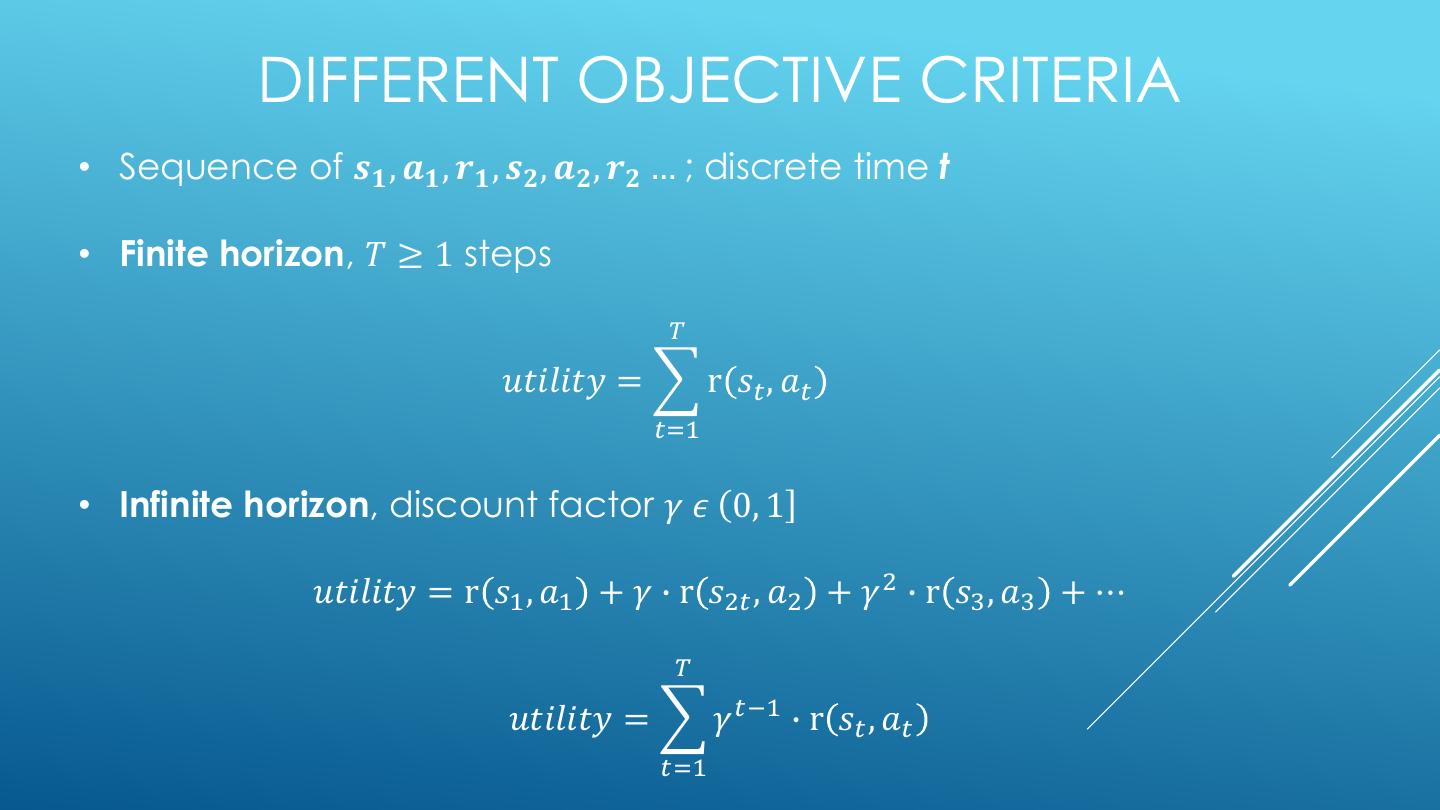 16 . DIFFERENT OBJECTIVE CRITERIA • Sequence of 𝒔𝟏 , 𝒂𝟏 , 𝒓𝟏 , 𝒔𝟐 , 𝒂𝟐 , 𝒓𝟐 … ; discrete time t • Finite horizon, 𝑇 ≥ 1 steps 𝑇 𝑢𝑡𝑖𝑙𝑖𝑡𝑦 = r 𝑠𝑡 , 𝑎𝑡 𝑡=1 • Infinite horizon, discount factor 𝛾 𝜖 ሺ0, 1ሿ 𝑢𝑡𝑖𝑙𝑖𝑡𝑦 = r 𝑠1 , 𝑎1 + 𝛾 ∙ r 𝑠2𝑡 , 𝑎2 + 𝛾 2 ∙ r 𝑠3 , 𝑎3 + ⋯ 𝑇 𝑢𝑡𝑖𝑙𝑖𝑡𝑦 = 𝛾 𝑡−1 ∙ r 𝑠𝑡 , 𝑎𝑡 𝑡=1