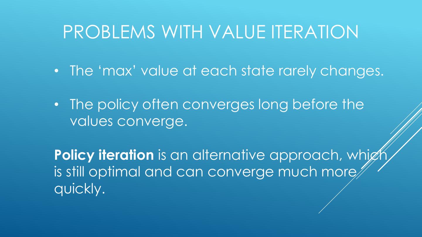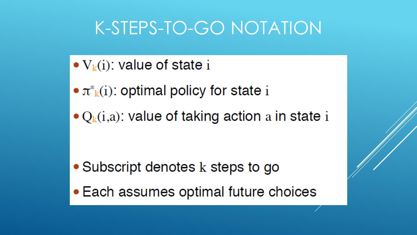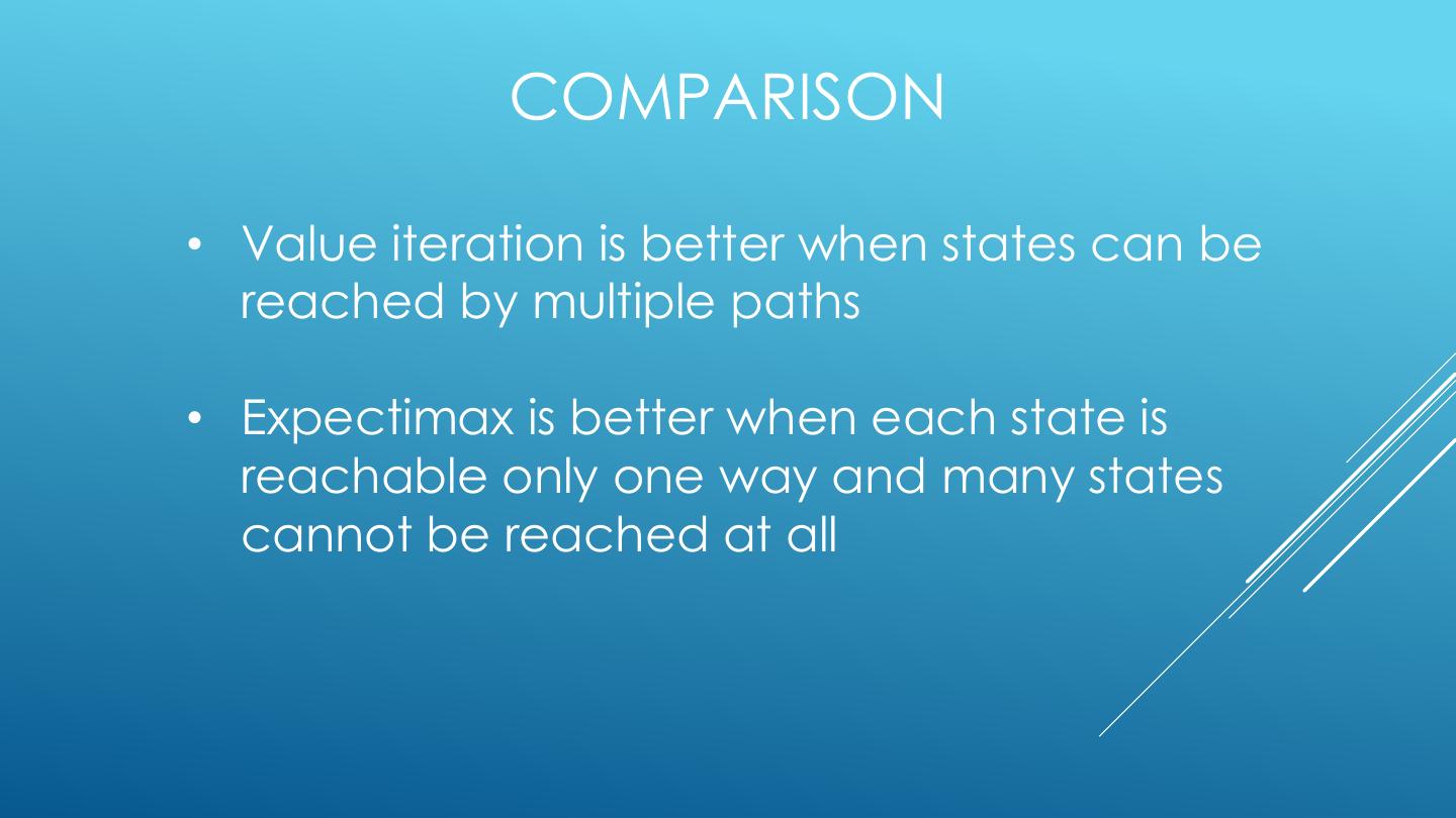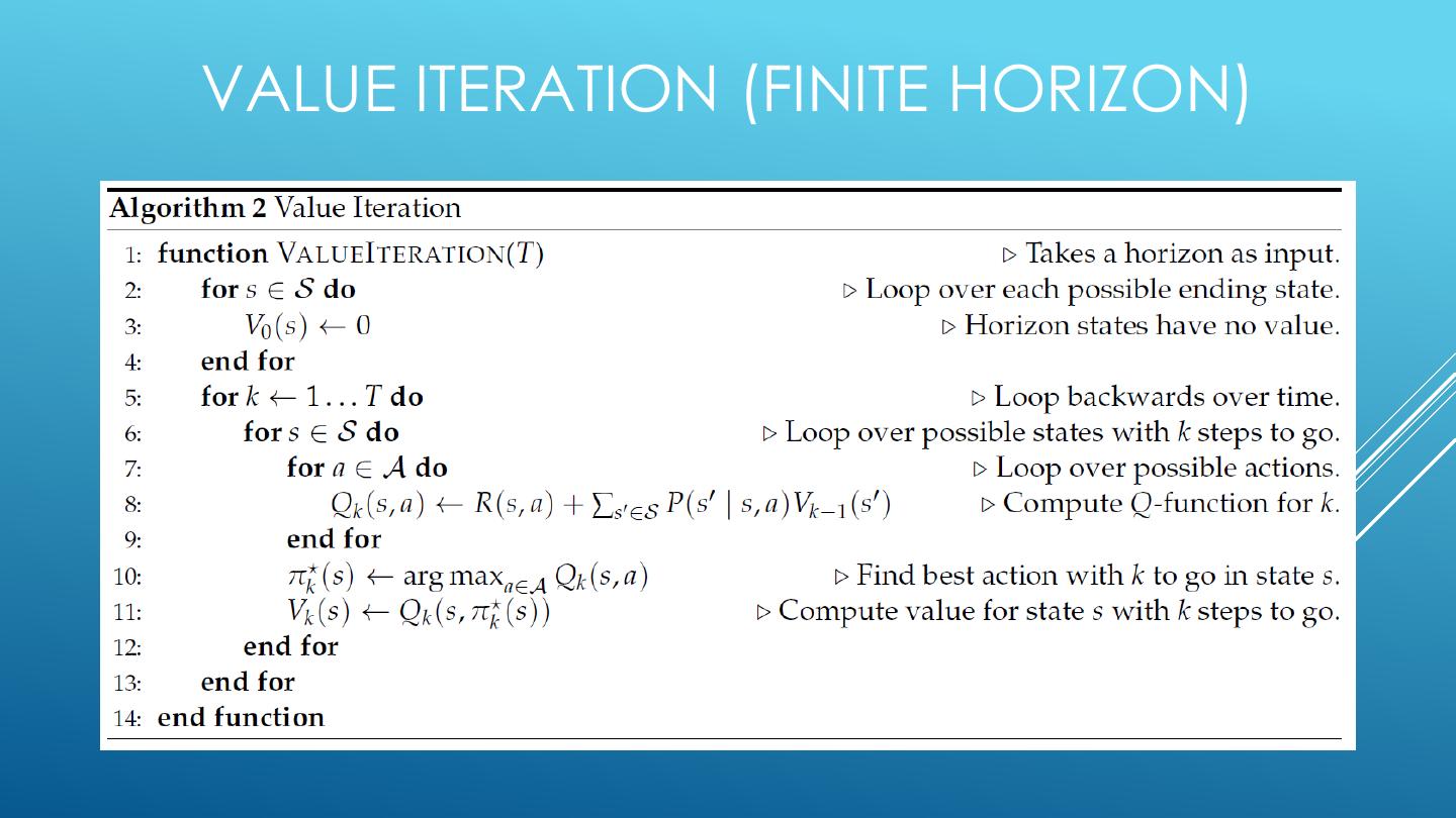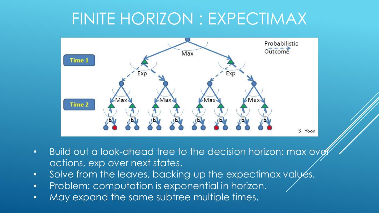 20 . FINITE HORIZON : EXPECTIMAX • Build out a look-ahead tree to the decision horizon; max over actions, exp over next states. • Solve from the leaves, backing-up the expectimax values. • Problem: computation is exponential in horizon. • May expand the same subtree multiple times.
