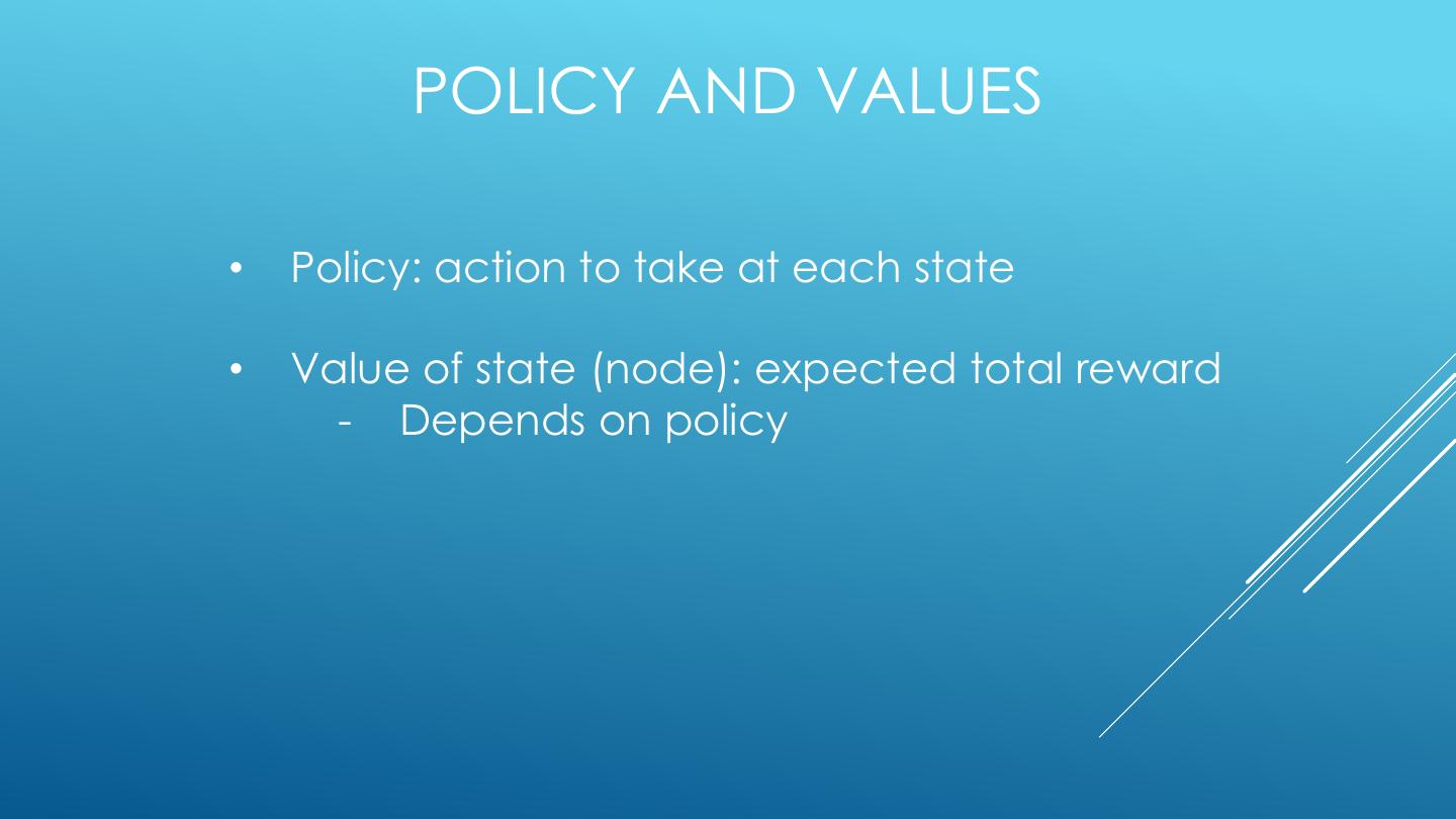 22 . POLICY AND VALUES • Policy: action to take at each state • Value of state (node): expected total reward - Depends on policy