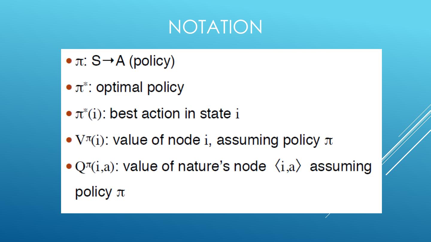 21 .EXPECTIMAX: A GAME AGAINST NATURE • Like a game except opponent is probabilistic • Strongly related minmax used in game theory • Nodes where you move: S ( ) • Nodes where nature moves: <S,A> ( )