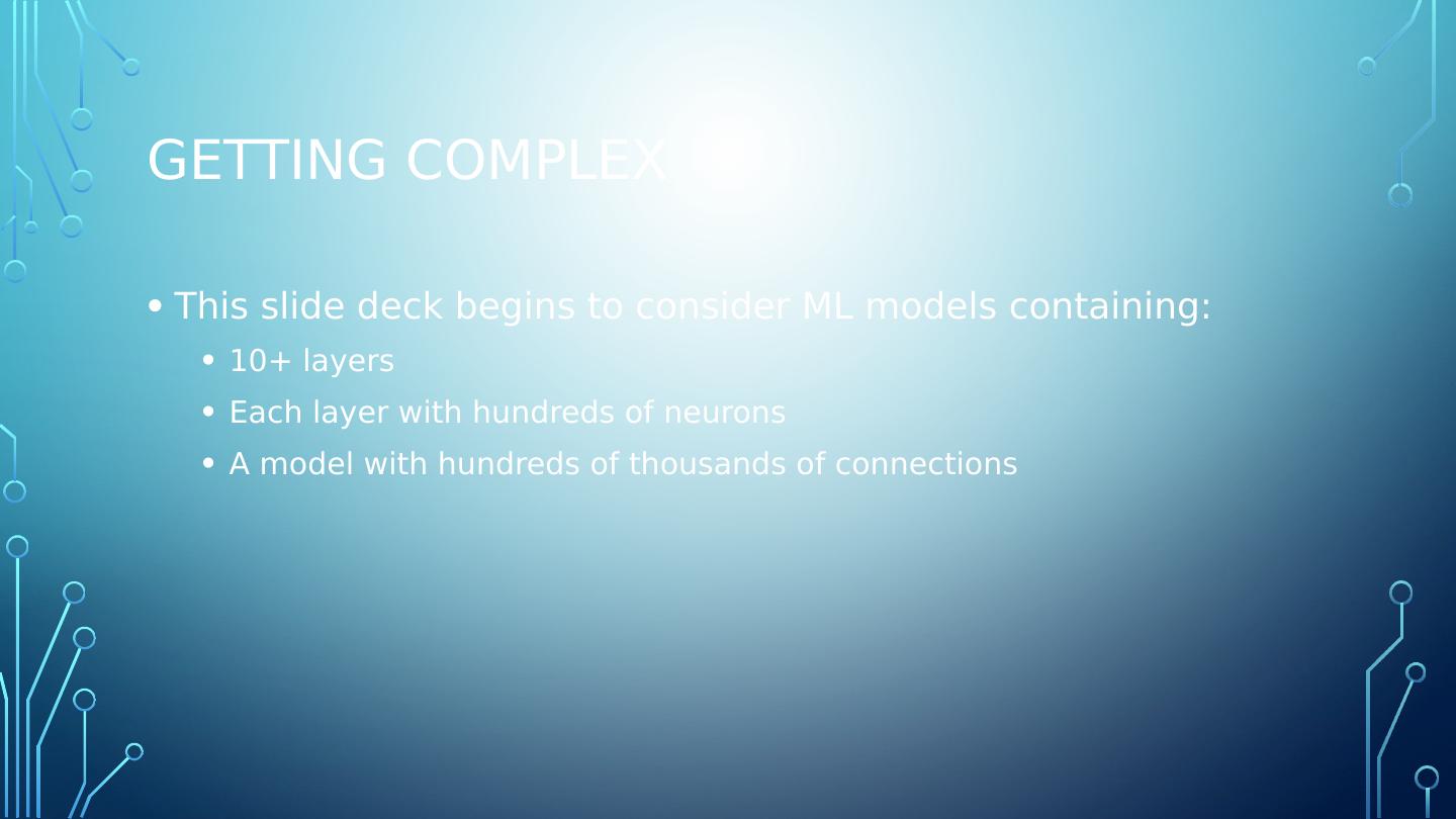 2 .Getting complex This slide deck begins to consider ML models containing: 10+ layers Each layer with hundreds of neurons A model with hundreds of thousands of connections