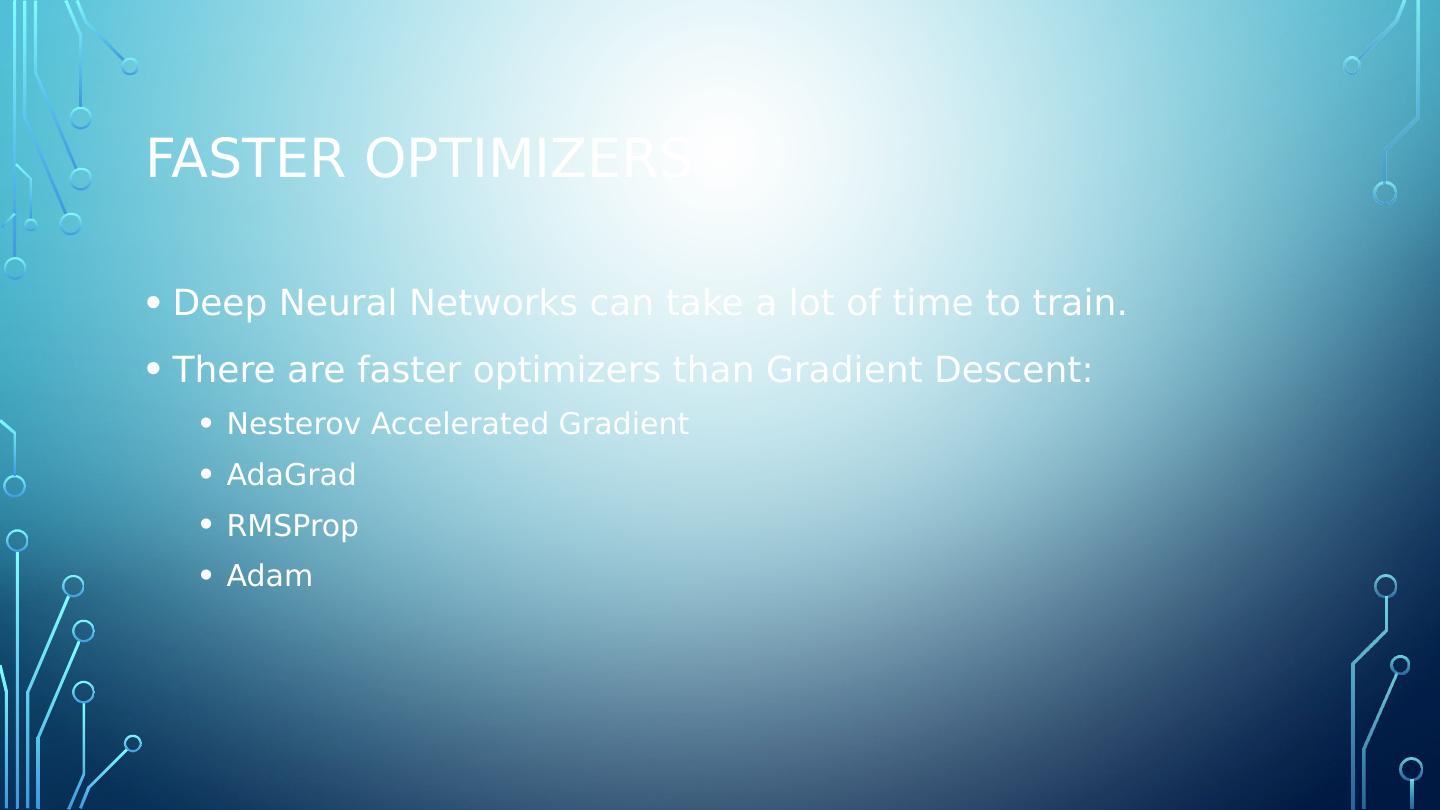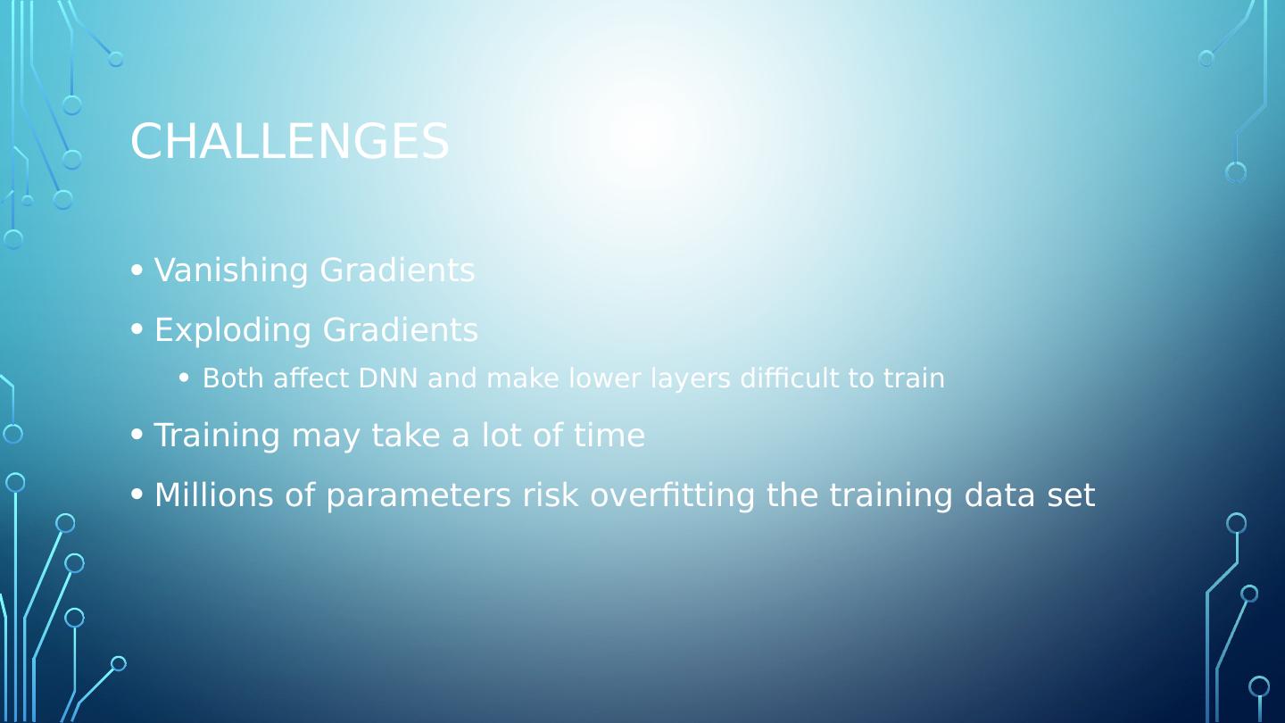 3 .challenges Vanishing Gradients Exploding Gradients Both affect DNN and make lower layers difficult to train Training may take a lot of time Millions of parameters risk overfitting the training data set