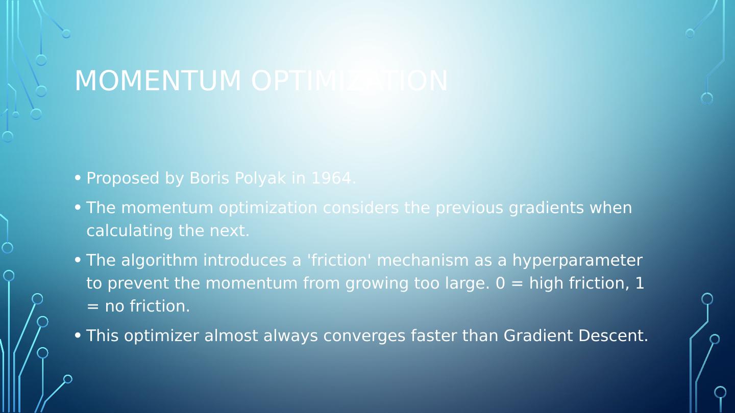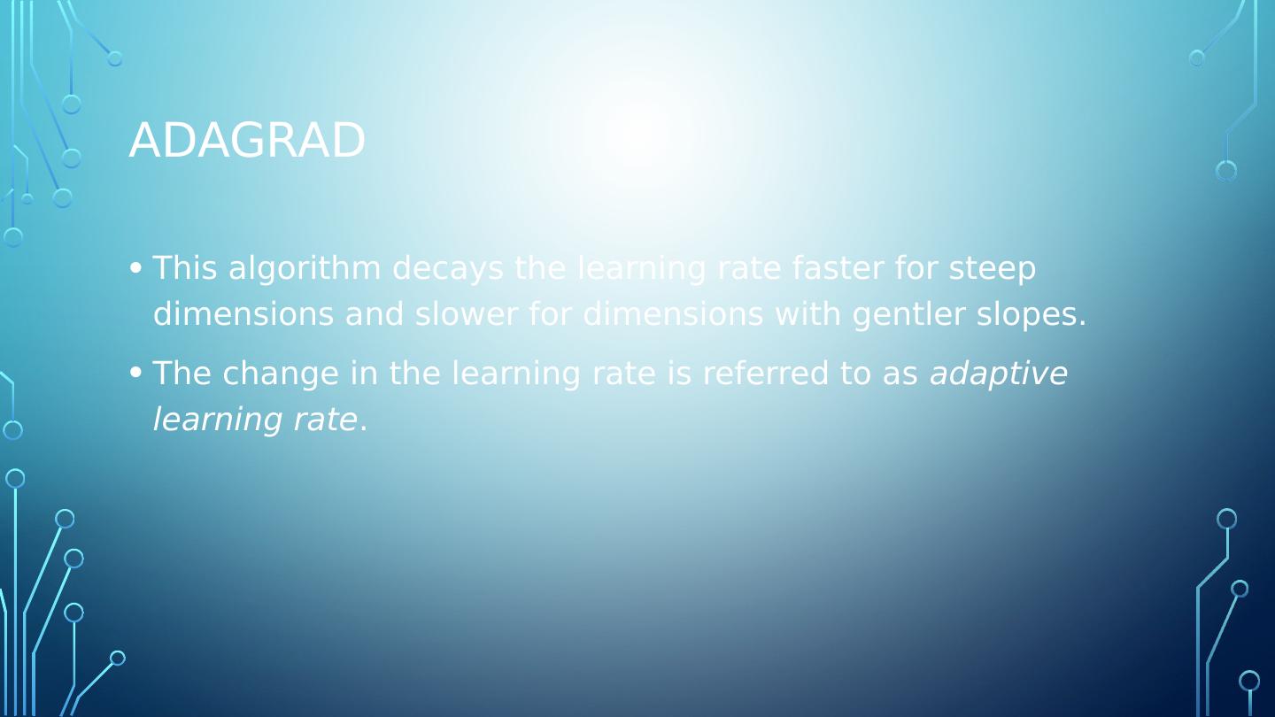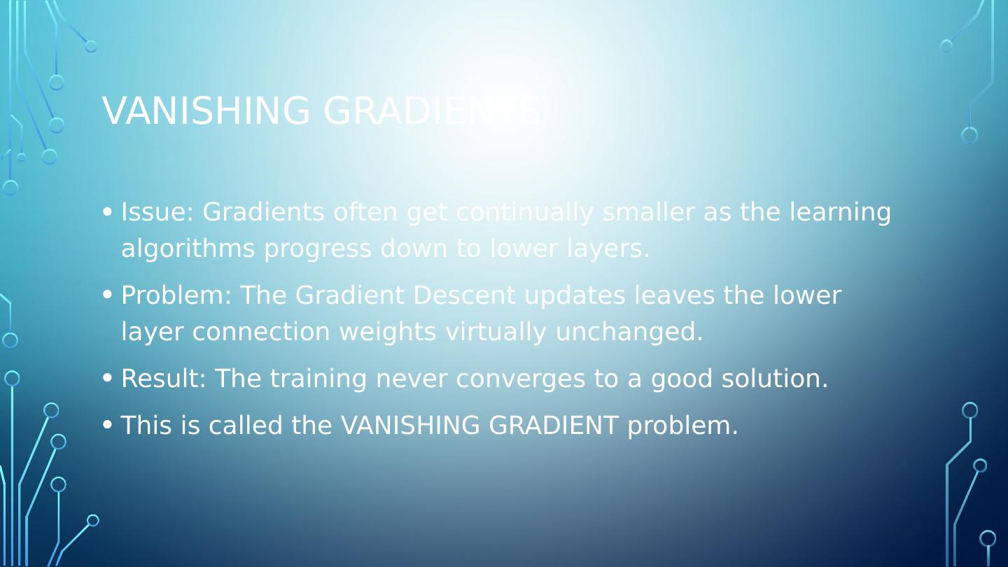 5 .Vanishing Gradients Issue: Gradients often get continually smaller as the learning algorithms progress down to lower layers. Problem: The Gradient Descent updates leaves the lower layer connection weights virtually unchanged. Result: The training never converges to a good solution. This is called the VANISHING GRADIENT problem.