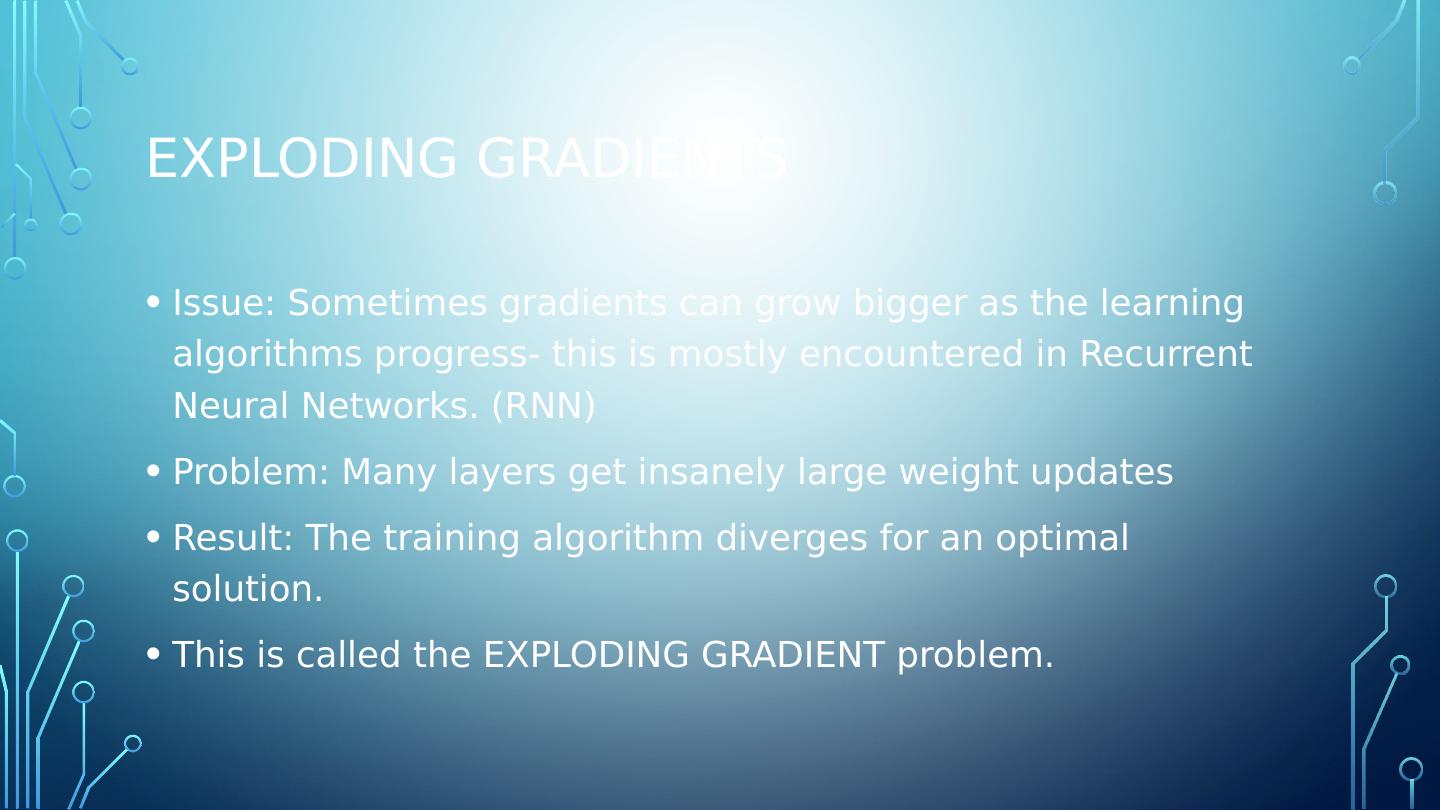 6 .Exploding Gradients Issue: Sometimes gradients can grow bigger as the learning algorithms progress- this is mostly encountered in Recurrent Neural Networks. (RNN) Problem: Many layers get insanely large weight updates Result: The training algorithm diverges for an optimal solution. This is called the EXPLODING GRADIENT problem.