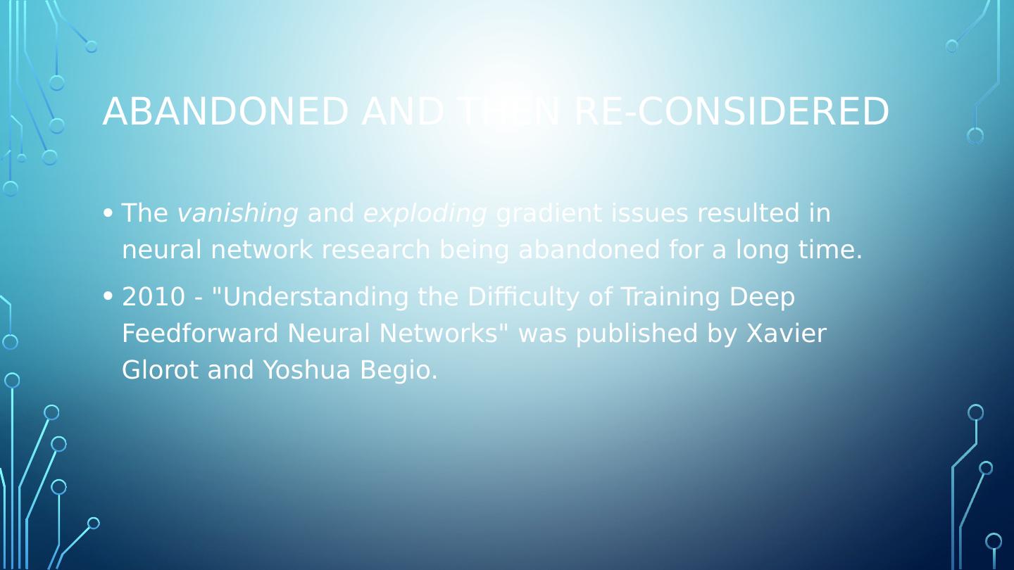 7 .Abandoned and then re-considered The vanishing and exploding gradient issues resulted in neural network research being abandoned for a long time. 2010 - "Understanding the Difficulty of Training Deep Feedforward Neural Networks" was published by Xavier Glorot and Yoshua Begio .
