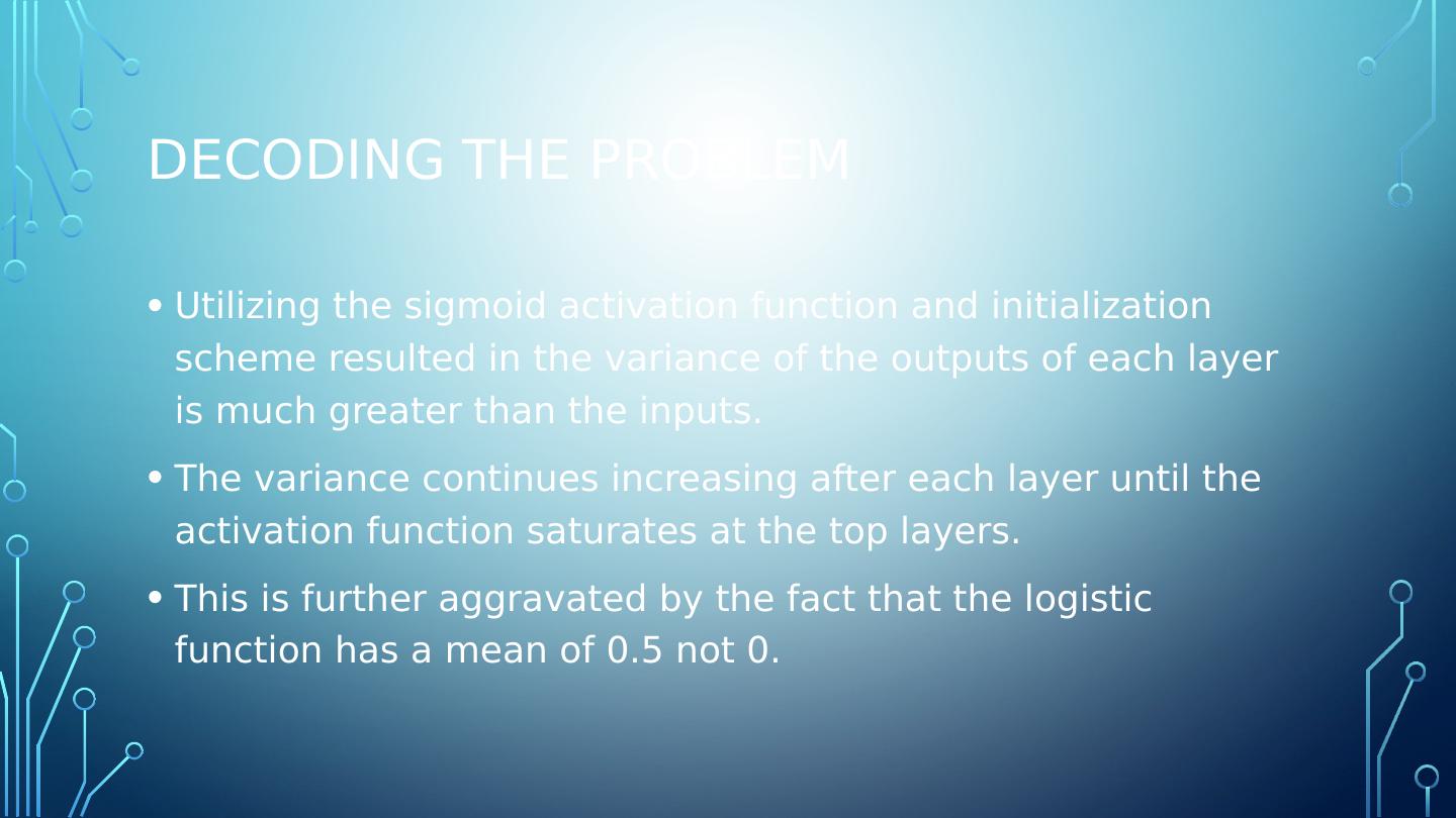9 .Decoding the problem Utilizing the sigmoid activation function and initialization scheme resulted in the variance of the outputs of each layer is much greater than the inputs. The variance continues increasing after each layer until the activation function saturates at the top layers. This is further aggravated by the fact that the logistic function has a mean of 0.5 not 0.