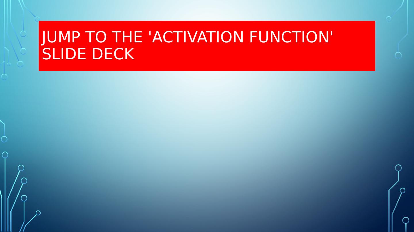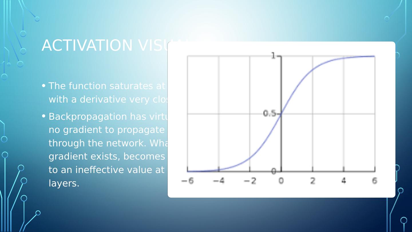 10 .Activation visual The function saturates at 0 or 1 with a derivative very close to 0. Backpropagation has virtually no gradient to propagate back through the network. What little gradient exists, becomes diluted to an ineffective value at lower layers.