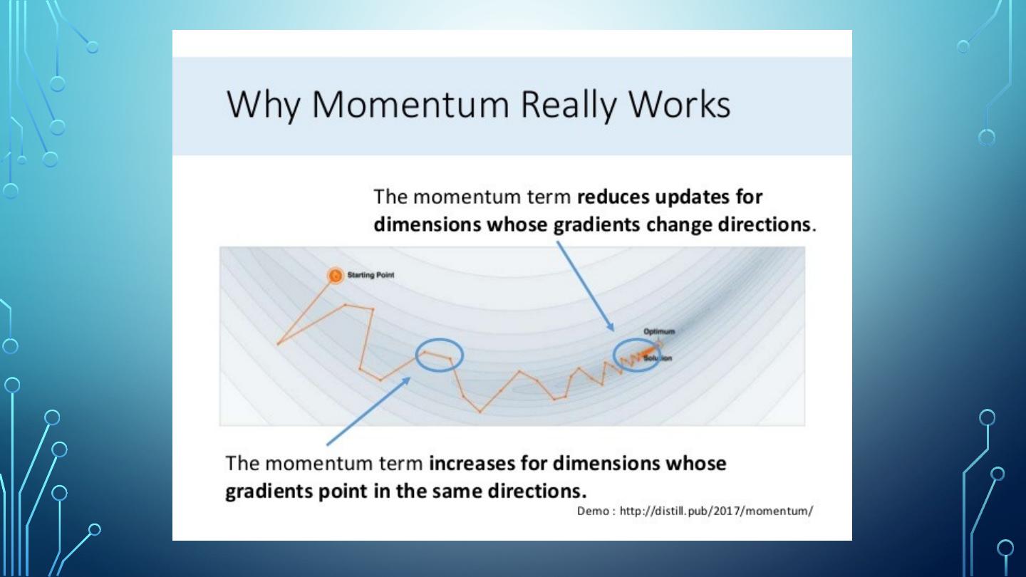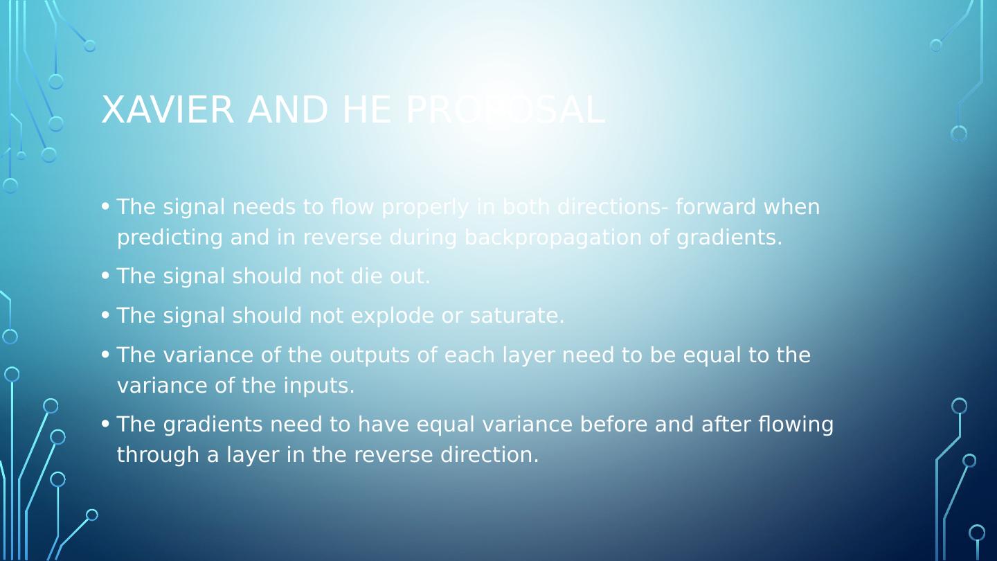 11 .Xavier and He proposal The signal needs to flow properly in both directions- forward when predicting and in reverse during backpropagation of gradients. The signal should not die out. The signal should not explode or saturate. The variance of the outputs of each layer need to be equal to the variance of the inputs. The gradients need to have equal variance before and after flowing through a layer in the reverse direction.