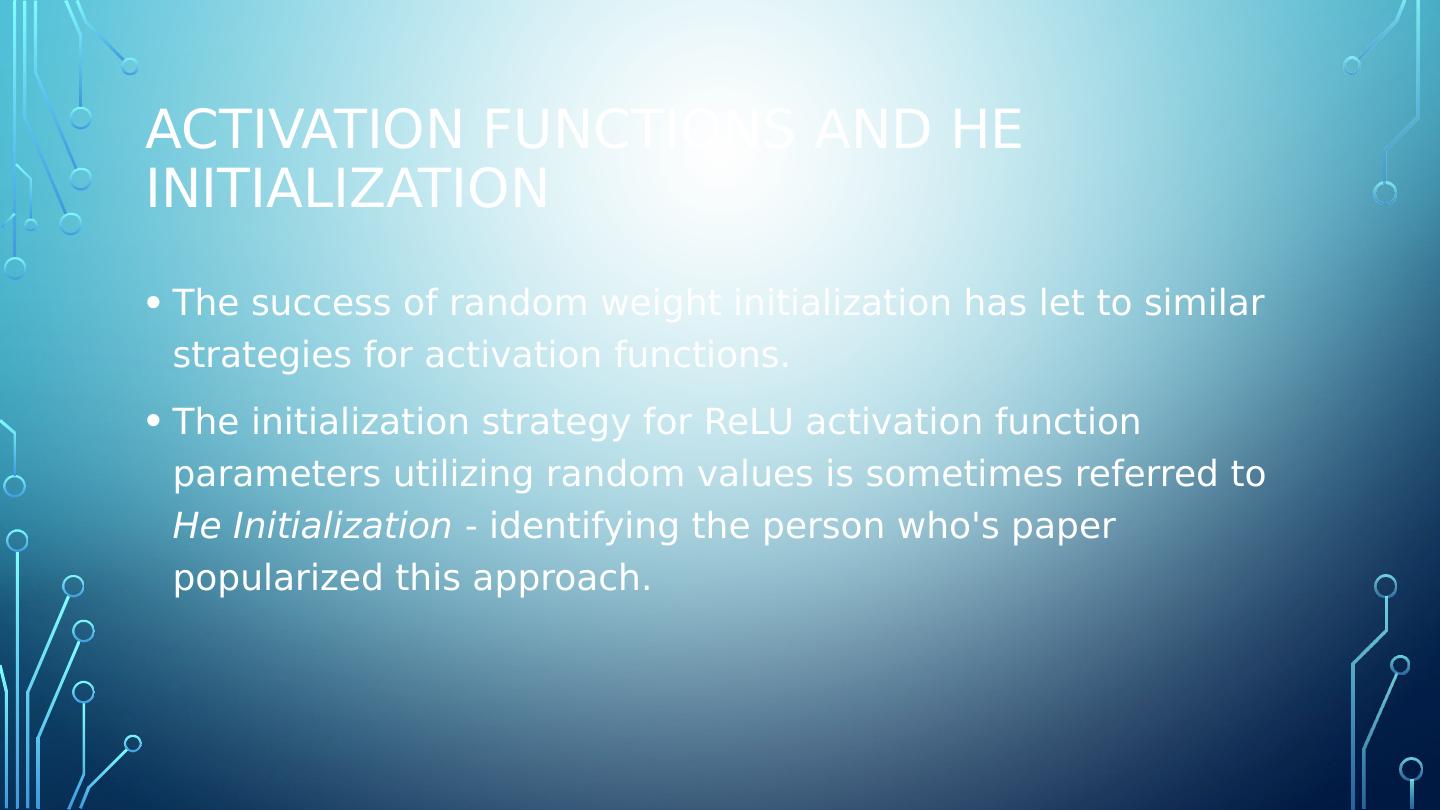 15 .Nonsaturating activation functions The Glorot and Bengio paper of 2010 identified the poor choice in selecting a biologically inspired activation function- sigmoid. However ReLU (Rectified Linear Unit) activation functions tend to be a better choice.