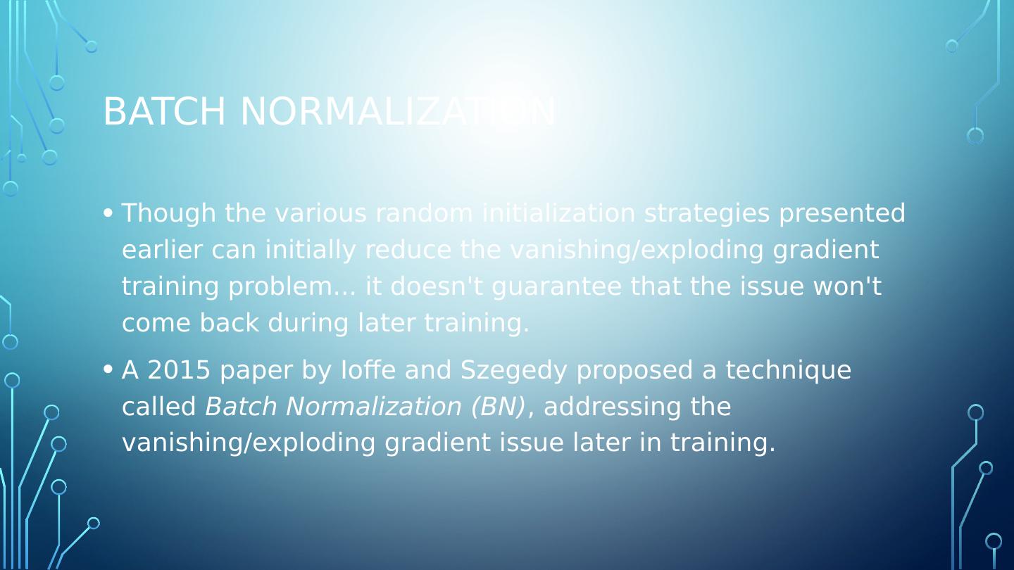 17 .Batch normalization Though the various random initialization strategies presented earlier can initially reduce the vanishing/exploding gradient training problem... it doesnt guarantee that the issue wont come back during later training. A 2015 paper by Ioffe and Szegedy proposed a technique called Batch Normalization (BN) , addressing the vanishing/exploding gradient issue later in training.
