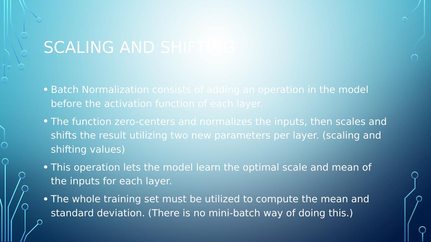18 .Scaling and shifting Batch Normalization consists of adding an operation in the model before the activation function of each layer. The function zero-centers and normalizes the inputs, then scales and shifts the result utilizing two new parameters per layer. (scaling and shifting values) This operation lets the model learn the optimal scale and mean of the inputs for each layer. The whole training set must be utilized to compute the mean and standard deviation. (There is no mini-batch way of doing this.)