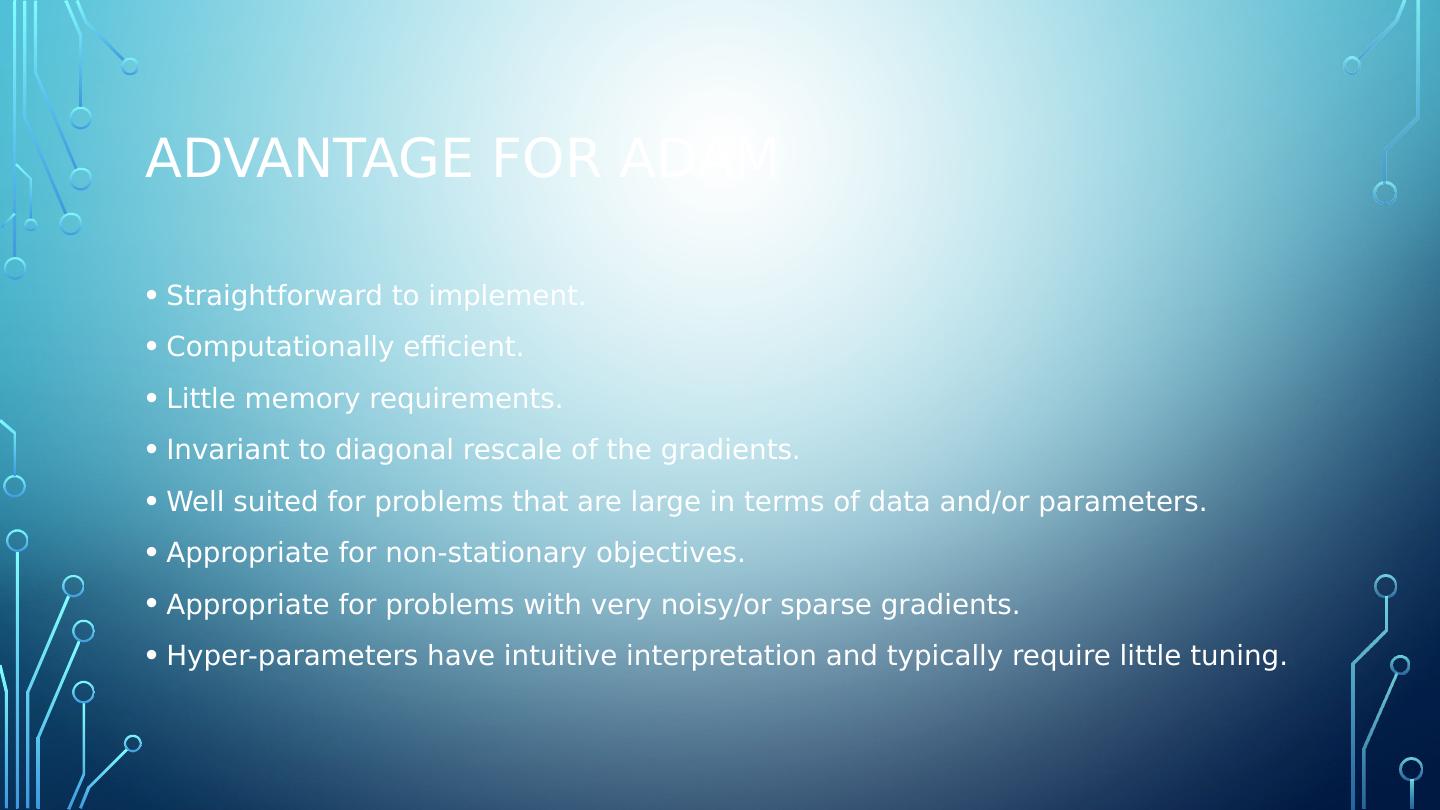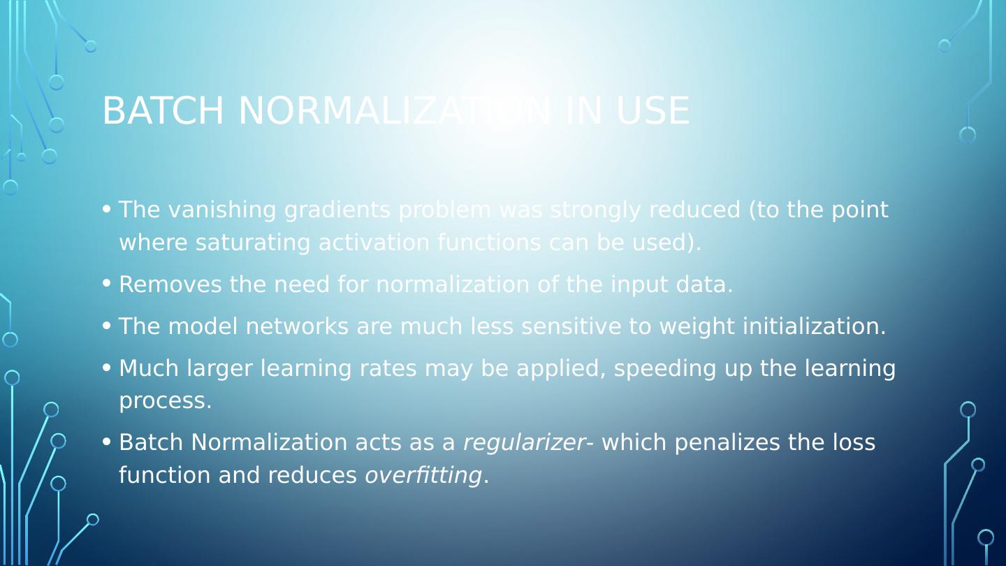 19 .Batch Normalization in use The vanishing gradients problem was strongly reduced (to the point where saturating activation functions can be used). Removes the need for normalization of the input data. The model networks are much less sensitive to weight initialization. Much larger learning rates may be applied, speeding up the learning process. Batch Normalization acts as a regularizer - which penalizes the loss function and reduces overfitting .