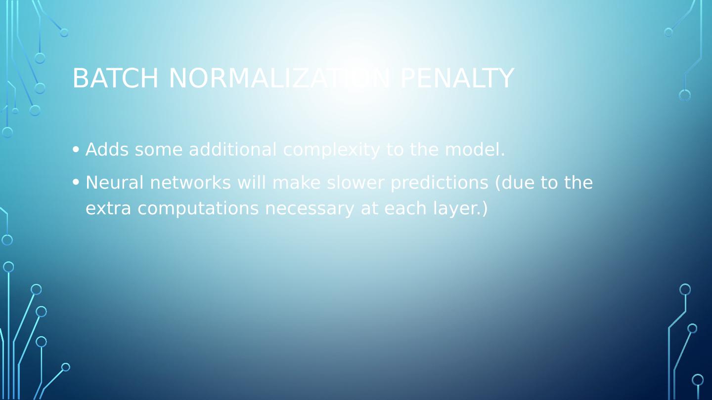20 .Batch normalization penalty Adds some additional complexity to the model. Neural networks will make slower predictions (due to the extra computations necessary at each layer.)