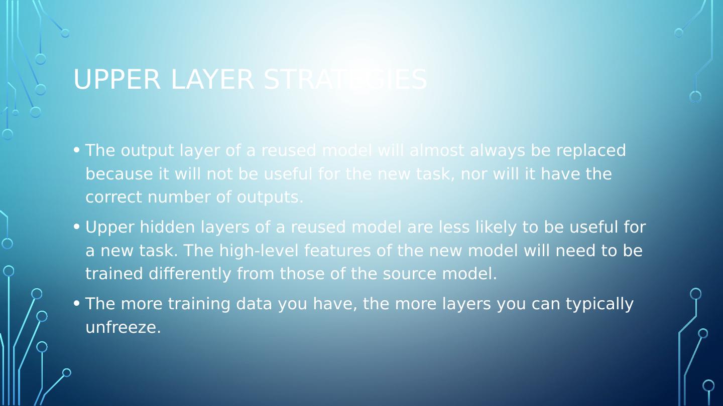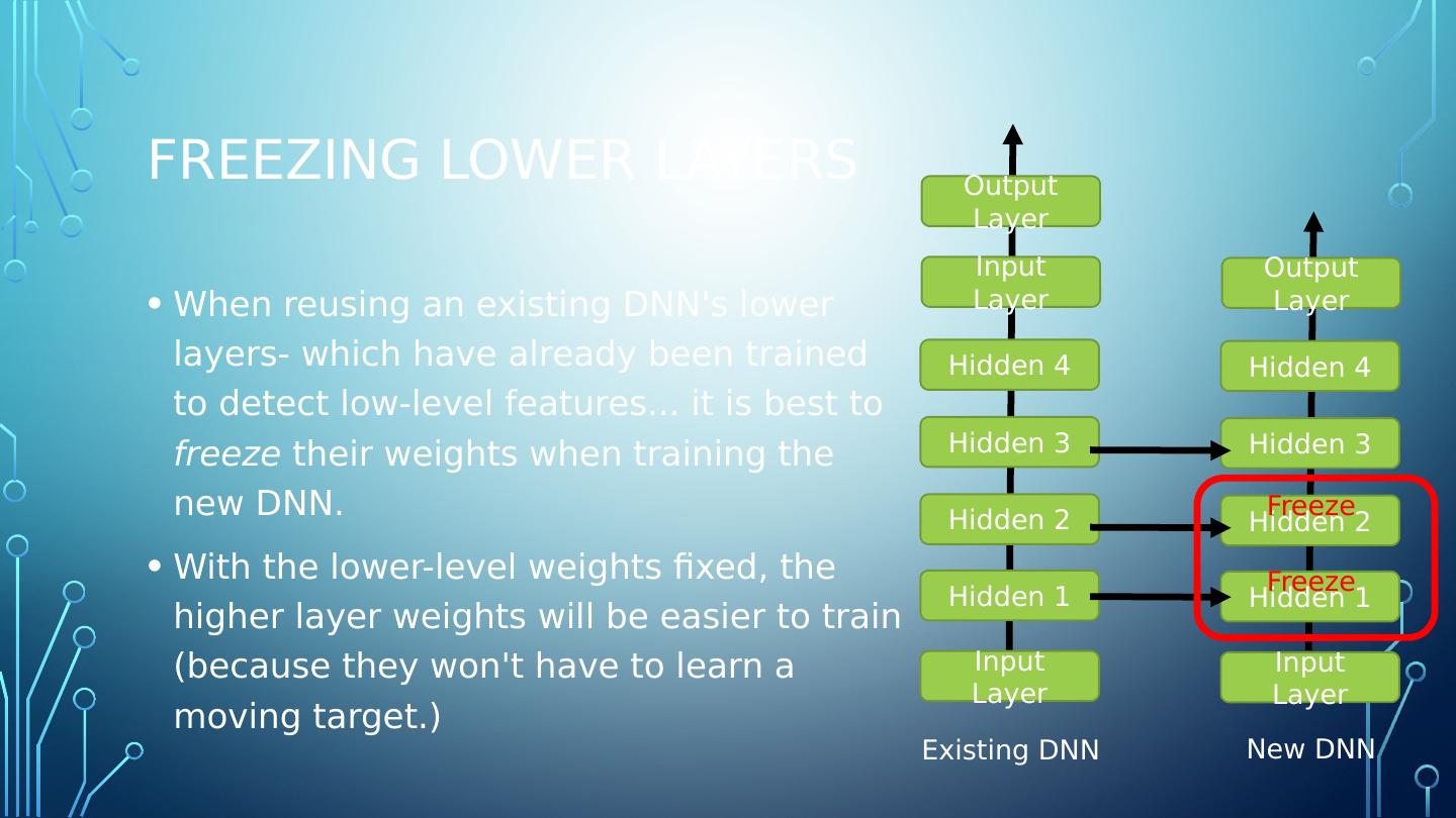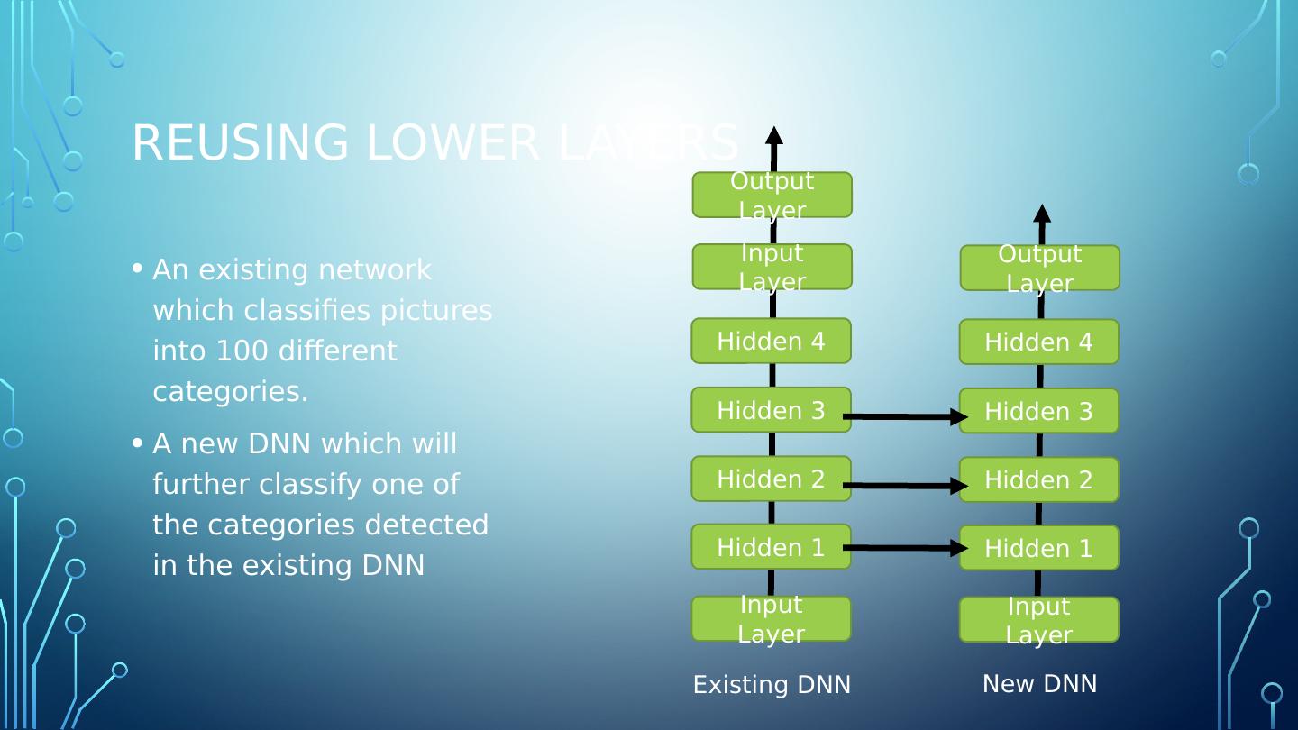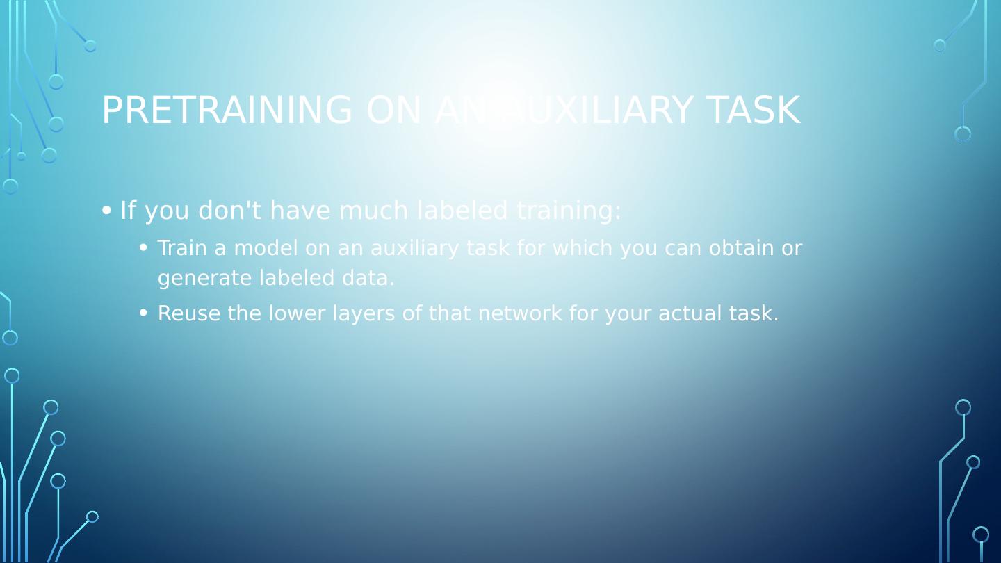 23 .Reusing pretrained layers It is always a good idea to try to locate an existing neural network that accomplishes a similar task, and re-using it, before endeavoring to train a very large DNN from scratch. Reuse the lower layers of the pre-trained neural network. This is known as transfer learning. Greatly speeds up the training process. Requires much less training data.