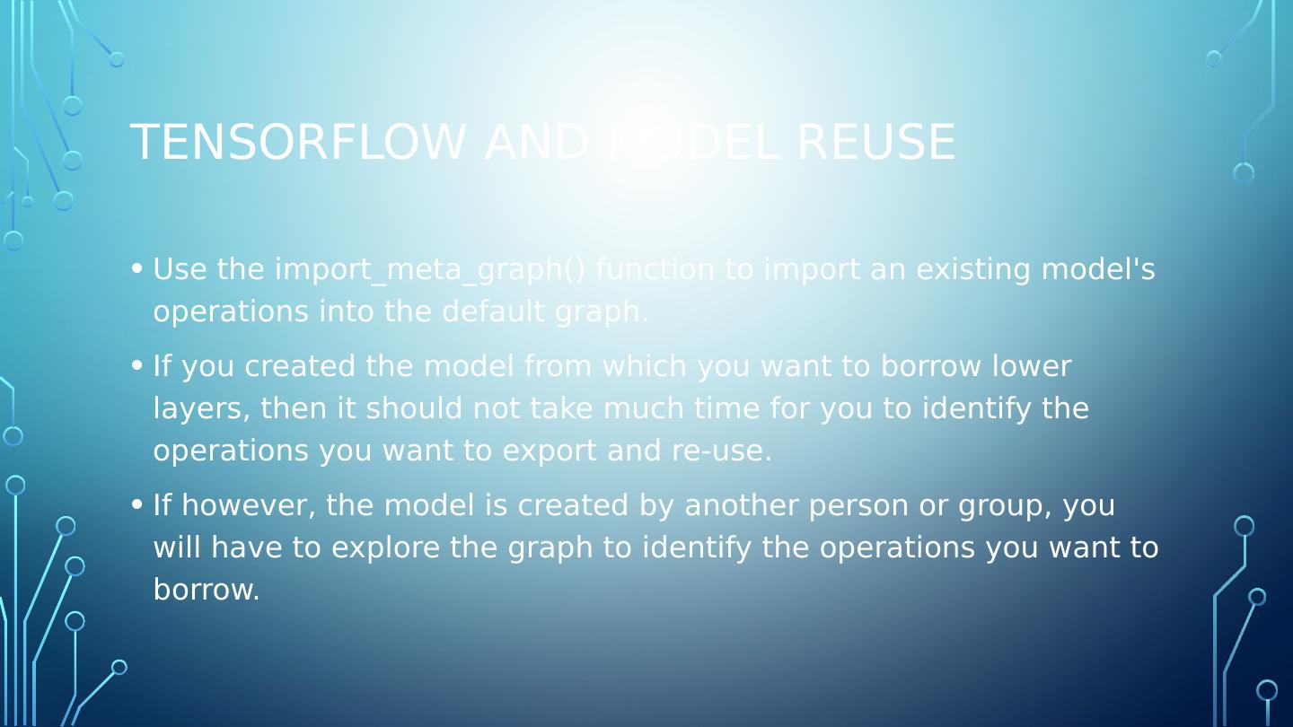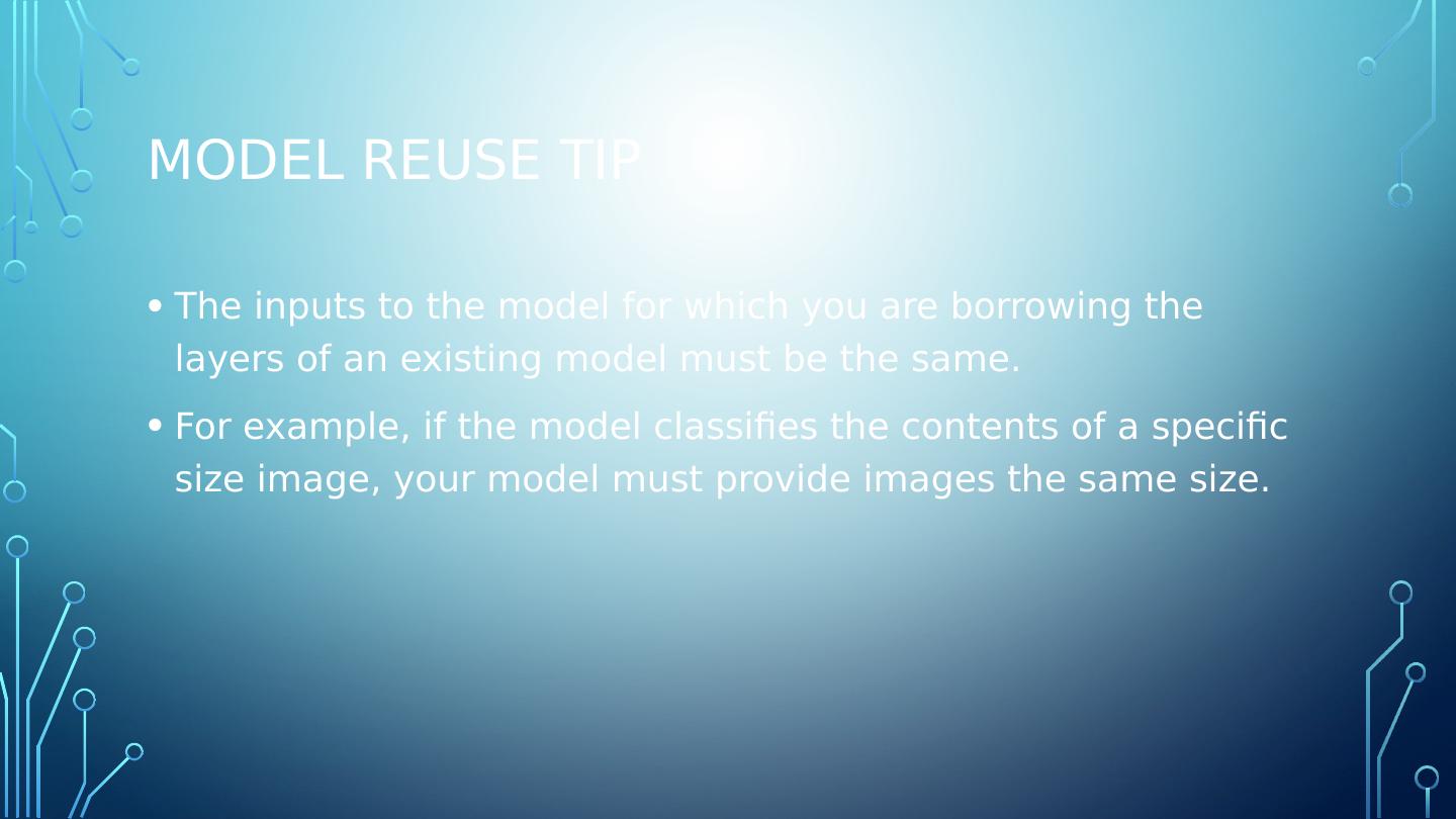 26 .Model reuse tip The inputs to the model for which you are borrowing the layers of an existing model must be the same. For example, if the model classifies the contents of a specific size image, your model must provide images the same size.