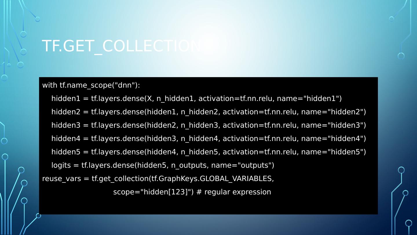 28 .Tf.get_collection with tf.name_scope (" dnn "): hidden1 = tf.layers.dense(X, n_hidden1, activation=tf.nn.relu, name="hidden1") hidden2 = tf.layers.dense(hidden1, n_hidden2, activation=tf.nn.relu, name="hidden2") hidden3 = tf.layers.dense(hidden2, n_hidden3, activation=tf.nn.relu, name="hidden3") hidden4 = tf.layers.dense(hidden3, n_hidden4, activation=tf.nn.relu, name="hidden4") hidden5 = tf.layers.dense(hidden4, n_hidden5, activation=tf.nn.relu, name="hidden5") logits = tf.layers.dense (hidden5, n_outputs , name="outputs") reuse_vars = tf.get_collection ( tf.GraphKeys.GLOBAL_VARIABLES , scope="hidden[123]") # regular expression