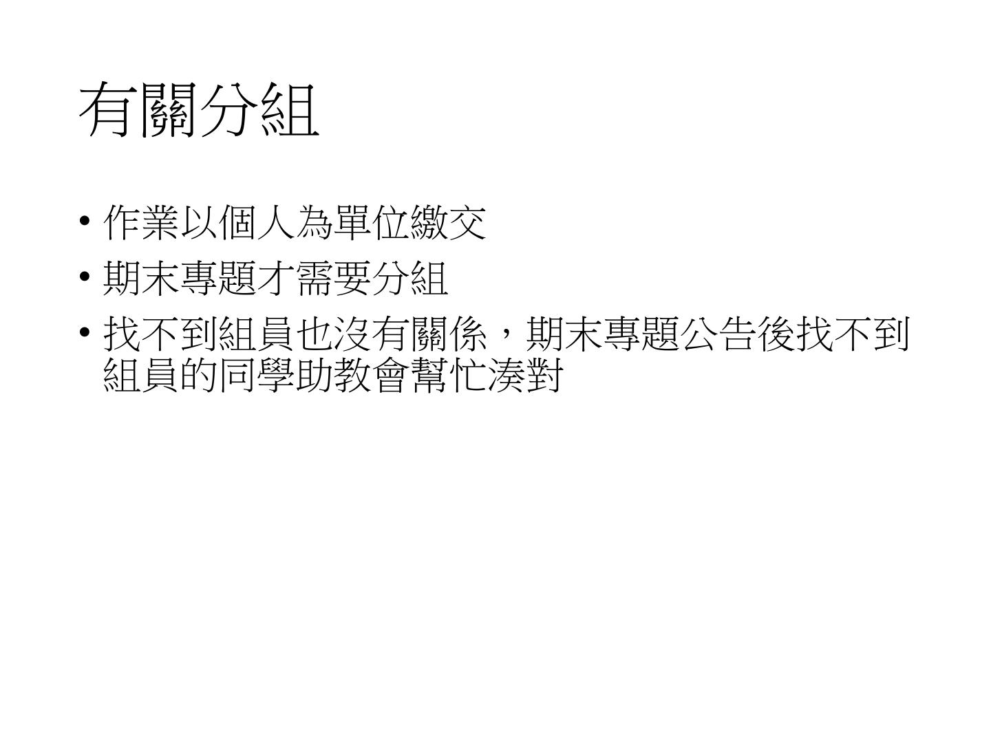 2 .有關分組 • 作業以個人為單位繳交 • 期末專題才需要分組 • 找不到組員也沒有關係,期末專題公告後找不到 組員的同學助教會幫忙湊對