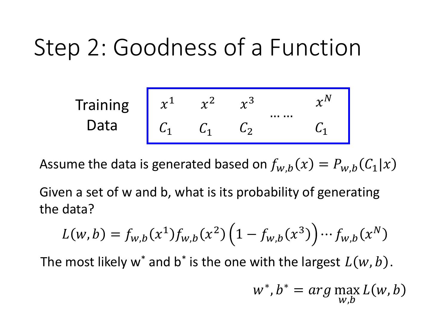 5 .Step 2: Goodness of a Function Training 𝑥1 𝑥2 𝑥3 𝑥𝑁 …… Data 𝐶1 𝐶1 𝐶2 𝐶1 Assume the data is generated based on 𝑓𝑤,𝑏 𝑥 = 𝑃𝑤,𝑏 𝐶1 |𝑥 Given a set of w and b, what is its probability of generating the data? 𝐿 𝑤, 𝑏 = 𝑓𝑤,𝑏 𝑥 1 𝑓𝑤,𝑏 𝑥 2 1 − 𝑓𝑤,𝑏 𝑥 3 ⋯ 𝑓𝑤,𝑏 𝑥 𝑁 The most likely w* and b* is the one with the largest 𝐿 𝑤, 𝑏 . 𝑤 ∗ , 𝑏 ∗ = 𝑎𝑟𝑔 max 𝐿 𝑤, 𝑏 𝑤,𝑏