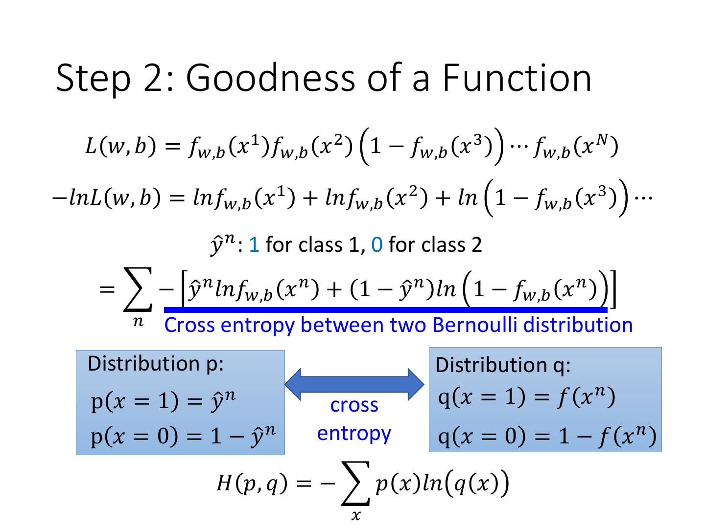 7 .Step 2: Goodness of a Function 𝐿 𝑤, 𝑏 = 𝑓𝑤,𝑏 𝑥 1 𝑓𝑤,𝑏 𝑥 2 1 − 𝑓𝑤,𝑏 𝑥 3 ⋯ 𝑓𝑤,𝑏 𝑥 𝑁 −𝑙𝑛𝐿 𝑤, 𝑏 = 𝑙𝑛𝑓𝑤,𝑏 𝑥 1 + 𝑙𝑛𝑓𝑤,𝑏 𝑥 2 + 𝑙𝑛 1 − 𝑓𝑤,𝑏 𝑥 3 ⋯ 𝑦ො 𝑛 : 1 for class 1, 0 for class 2 = − 𝑦ො 𝑛 𝑙𝑛𝑓𝑤,𝑏 𝑥 𝑛 + 1 − 𝑦ො 𝑛 𝑙𝑛 1 − 𝑓𝑤,𝑏 𝑥 𝑛 𝑛 Cross entropy between two Bernoulli distribution Distribution p: Distribution q: p 𝑥 = 1 = 𝑦ො 𝑛 cross q 𝑥 = 1 = 𝑓 𝑥𝑛 p 𝑥 = 0 = 1 − 𝑦ො 𝑛 entropy q 𝑥 = 0 = 1 − 𝑓 𝑥𝑛 𝐻 𝑝, 𝑞 = − 𝑝 𝑥 𝑙𝑛 𝑞 𝑥 𝑥