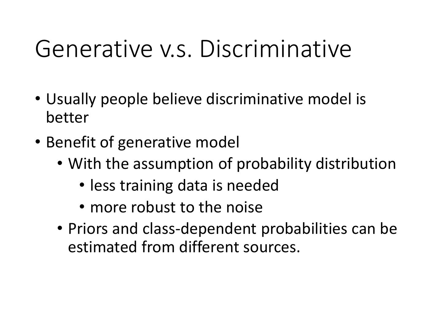 23 .Generative v.s. Discriminative • Usually people believe discriminative model is better • Benefit of generative model • With the assumption of probability distribution • less training data is needed • more robust to the noise • Priors and class-dependent probabilities can be estimated from different sources.