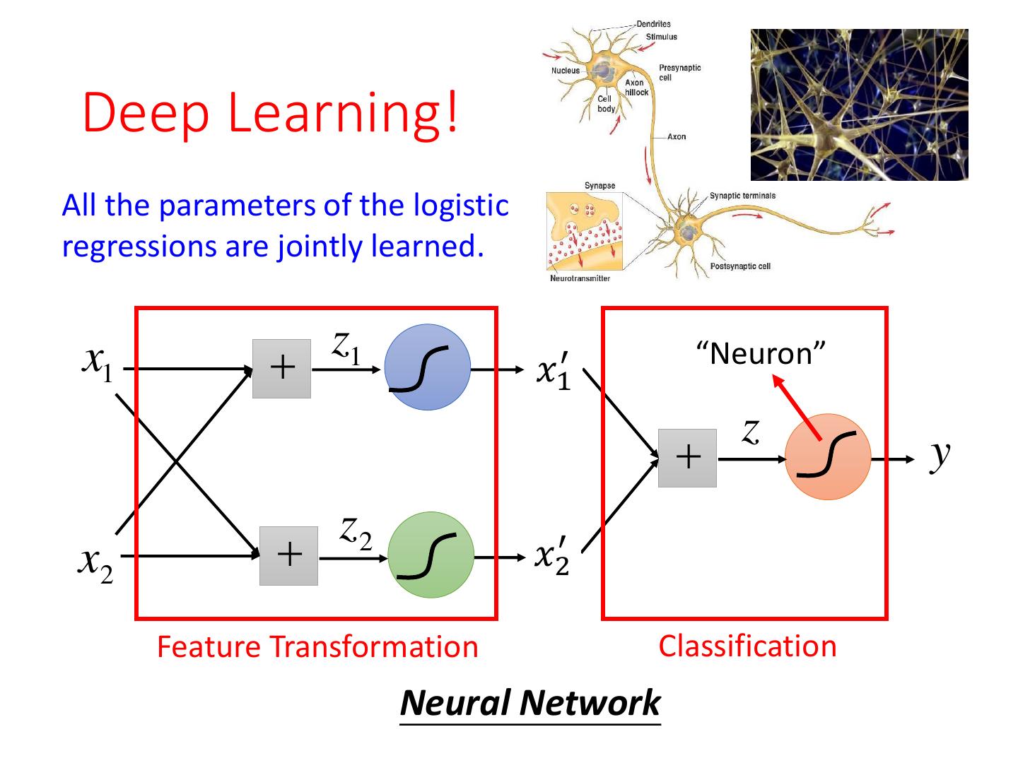 28 .Limitation of Logistic Regression • Cascading logistic regression models z1 x1 𝑥1′ z y z2 x2 𝑥2′ Feature Transformation Classification (ignore bias in this figure)