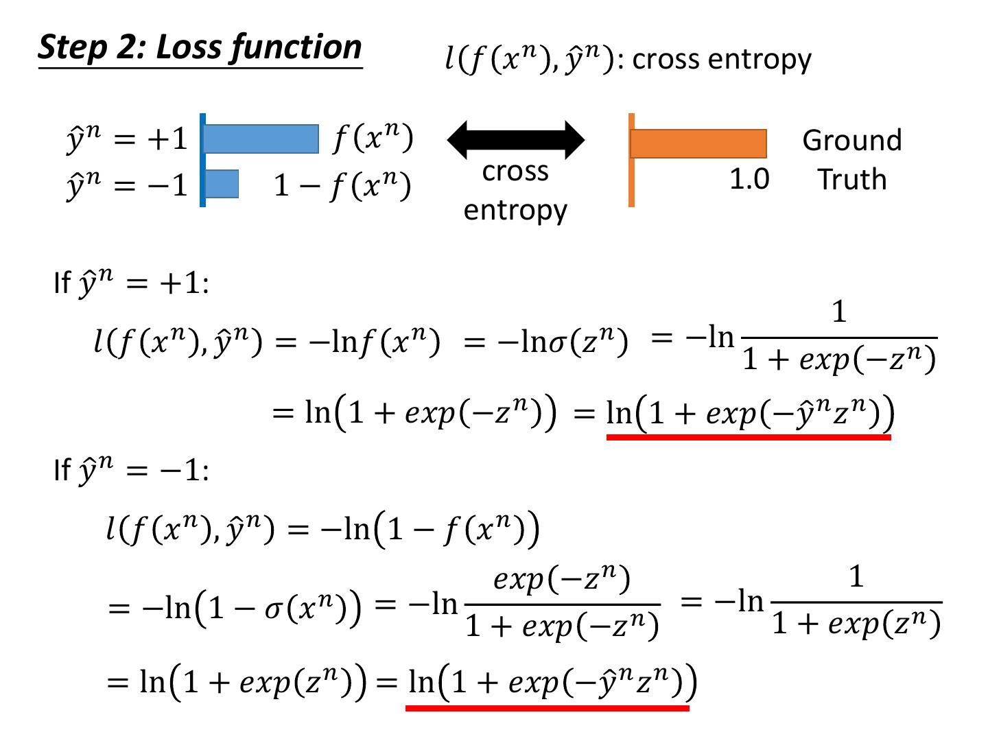 8 .Step 2: Goodness of a Function 𝐿 𝑤, 𝑏 = 𝑓𝑤,𝑏 𝑥 1 𝑓𝑤,𝑏 𝑥 2 1 − 𝑓𝑤,𝑏 𝑥 3 ⋯ 𝑓𝑤,𝑏 𝑥 𝑁 −𝑙𝑛𝐿 𝑤, 𝑏 = 𝑙𝑛𝑓𝑤,𝑏 𝑥 1 + 𝑙𝑛𝑓𝑤,𝑏 𝑥 2 + 𝑙𝑛 1 − 𝑓𝑤,𝑏 𝑥 3 ⋯ 𝑦ො 𝑛 : 1 for class 1, 0 for class 2 = − 𝑦ො 𝑛 𝑙𝑛𝑓𝑤,𝑏 𝑥 𝑛 + 1 − 𝑦ො 𝑛 𝑙𝑛 1 − 𝑓𝑤,𝑏 𝑥 𝑛 𝑛 Cross entropy between two Bernoulli distribution minimize 1.0 𝑓 𝑥𝑛 0.0 cross 1 − 𝑓 𝑥𝑛 Ground Truth entropy 𝑦ො 𝑛 = 1