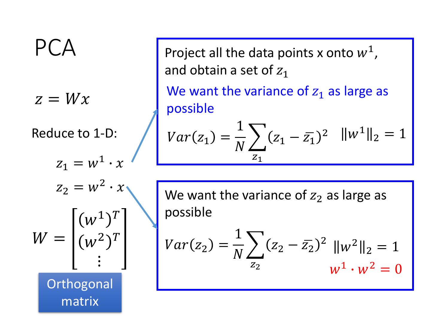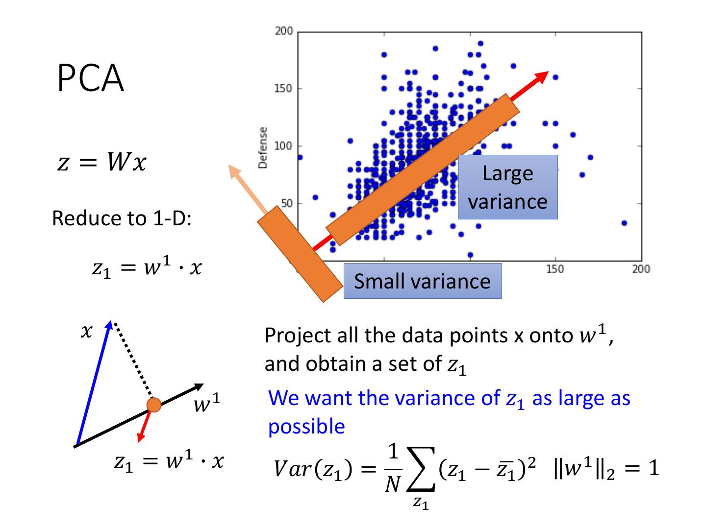 9 .PCA 𝑧 = 𝑊𝑥 Large variance Reduce to 1-D: 𝑧1 = 𝑤 1 ∙ 𝑥 Small variance 𝑥 Project all the data points x onto 𝑤 1 , and obtain a set of 𝑧1 𝑤1 We want the variance of 𝑧1 as large as possible 𝑧1 = 𝑤 1 ∙ 𝑥 1 𝑉𝑎𝑟 𝑧1 = 𝑧1 − 𝑧ഥ1 2 𝑤 1 2 = 1 𝑁 𝑧1