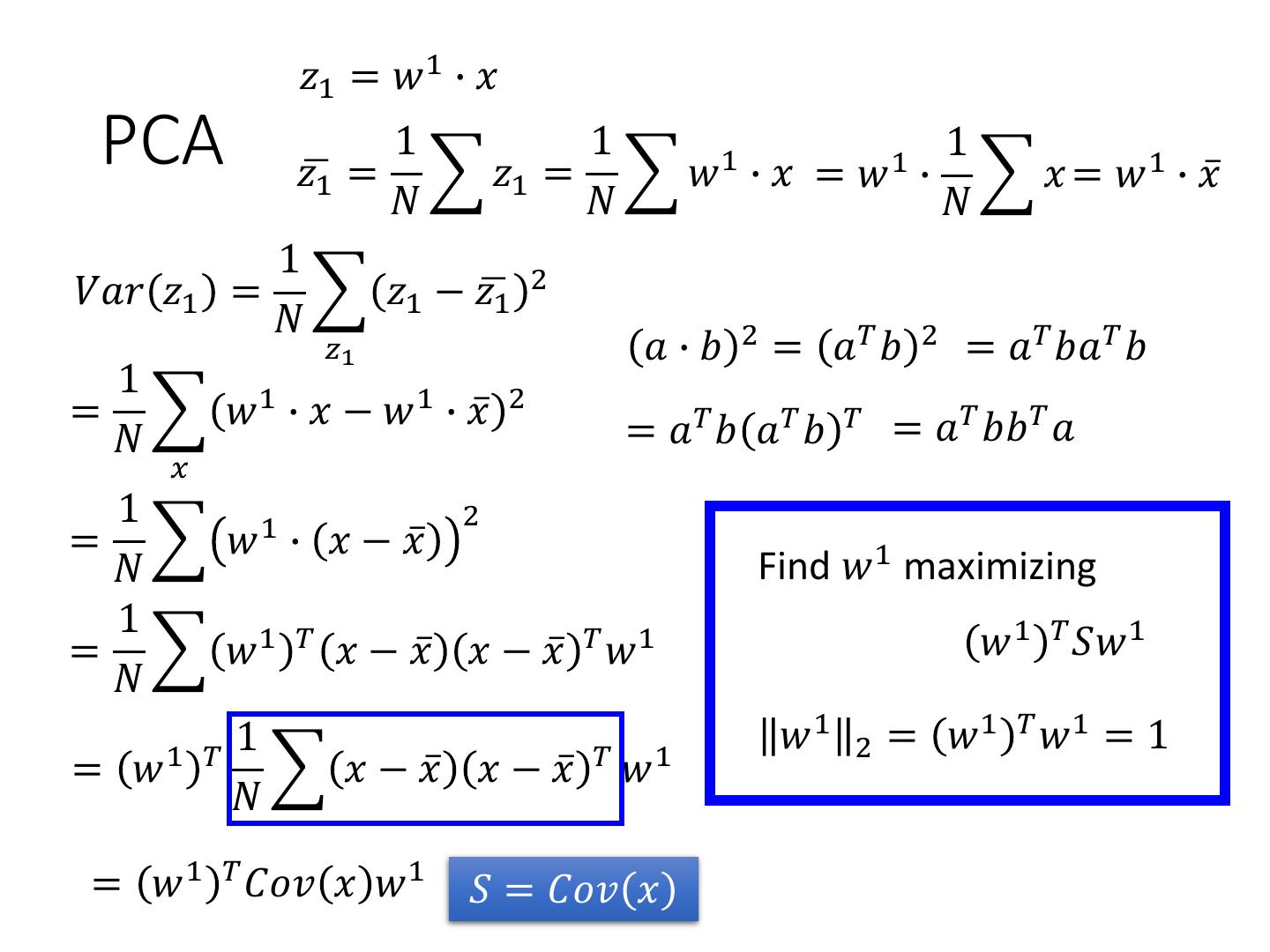 12 . 𝑧1 = 𝑤 1 ∙ 𝑥 PCA 1 1 1 1 1 𝑧ഥ1 = 𝑧1 = 𝑤 ∙ 𝑥 = 𝑤 ∙ 𝑥 = 𝑤 1 ∙ 𝑥ҧ 𝑁 𝑁 𝑁 1 𝑉𝑎𝑟 𝑧1 = 𝑧1 − 𝑧ഥ1 2 𝑁 𝑧1 𝑎 ∙ 𝑏 2 = 𝑎𝑇 𝑏 2 = 𝑎𝑇 𝑏𝑎𝑇 𝑏 1 = 𝑤 1 ∙ 𝑥 − 𝑤 1 ∙ 𝑥ҧ 2 = 𝑎𝑇 𝑏 𝑎𝑇 𝑏 𝑇 = 𝑎𝑇 𝑏𝑏 𝑇 𝑎 𝑁 𝑥 1 1 2 = 𝑤 ∙ 𝑥 − 𝑥ҧ 𝑁 Find 𝑤 1 maximizing 1 = 𝑤 1 𝑇 𝑥 − 𝑥ҧ 𝑥 − 𝑥ҧ 𝑇 𝑤 1 𝑤 1 𝑇 𝑆𝑤 1 𝑁 1 𝑇 1 𝑤1 2 = 𝑤1 𝑇 𝑤1 = 1 = 𝑤 𝑥 − 𝑥ҧ 𝑥 − 𝑥ҧ 𝑇 𝑤 1 𝑁 = 𝑤 1 𝑇 𝐶𝑜𝑣 𝑥 𝑤 1 𝑆 = 𝐶𝑜𝑣 𝑥