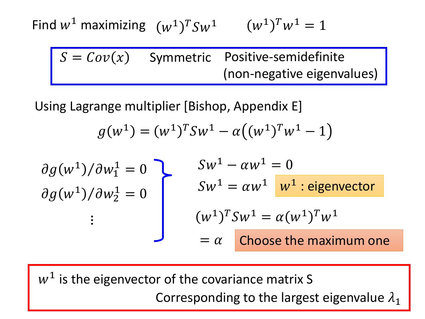 13 .Find 𝑤 1 maximizing 𝑤 1 𝑇 𝑆𝑤 1 𝑤1 𝑇 𝑤1 = 1 𝑆 = 𝐶𝑜𝑣 𝑥 Symmetric Positive-semidefinite (non-negative eigenvalues) Using Lagrange multiplier [Bishop, Appendix E] 𝑔 𝑤 1 = 𝑤 1 𝑇 𝑆𝑤 1 − 𝛼 𝑤 1 𝑇 𝑤 1 − 1 𝜕𝑔 𝑤1 Τ𝜕𝑤11 =0 𝑆𝑤 1 − 𝛼𝑤 1 = 0 𝑆𝑤 1 = 𝛼𝑤 1 𝑤 1 : eigenvector 𝜕𝑔 𝑤 1 Τ𝜕𝑤21 = 0 𝑤 1 𝑇 𝑆𝑤 1 = 𝛼 𝑤 1 𝑇 𝑤 1 … =𝛼 Choose the maximum one 𝑤 1 is the eigenvector of the covariance matrix S Corresponding to the largest eigenvalue 𝜆1