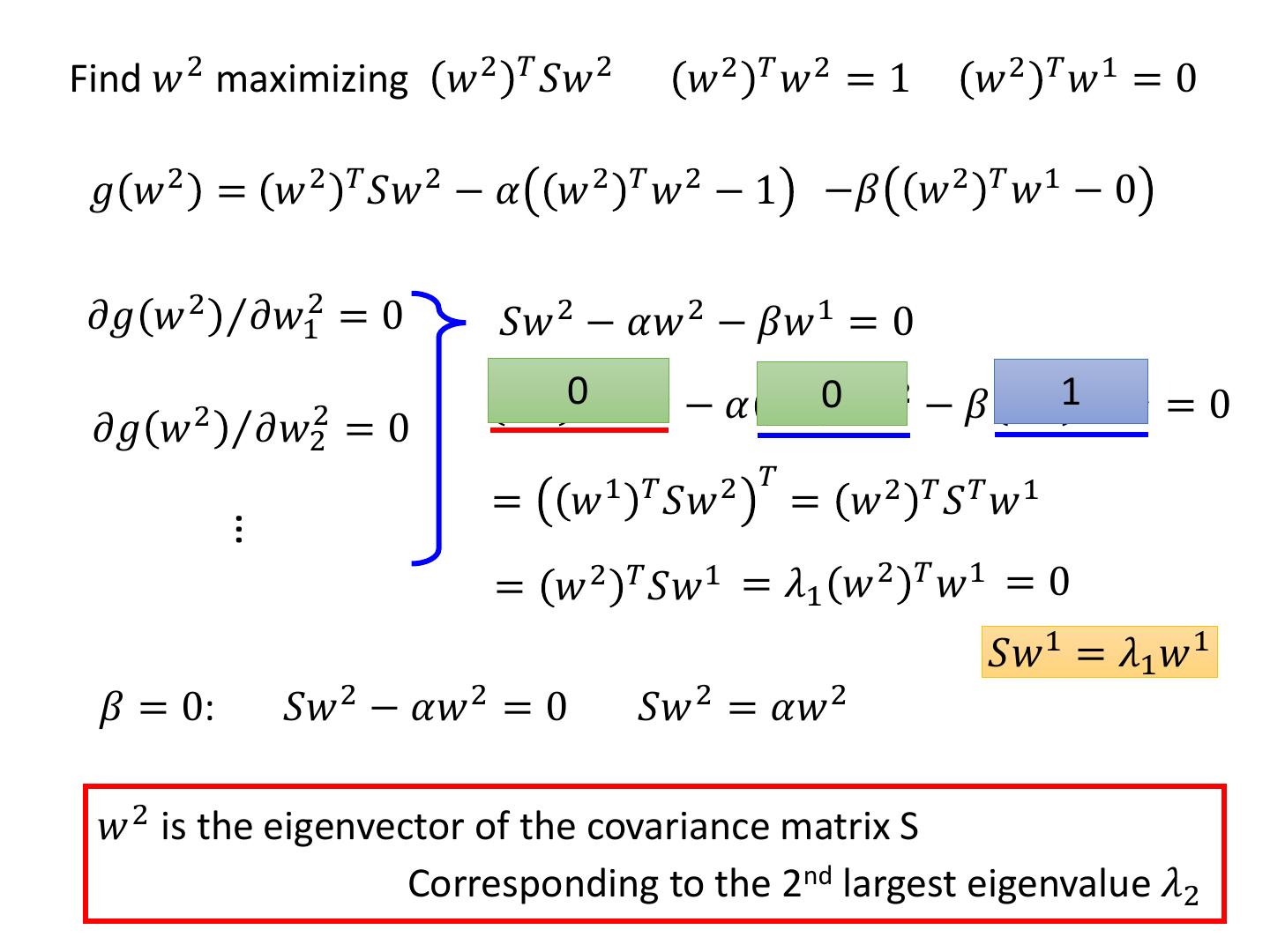 14 .Find 𝑤 2 maximizing 𝑤 2 𝑇 𝑆𝑤 2 𝑤2 𝑇𝑤2 = 1 𝑤 2 𝑇 𝑤1 = 0 𝑔 𝑤 2 = 𝑤 2 𝑇 𝑆𝑤 2 − 𝛼 𝑤 2 𝑇 𝑤 2 − 1 −𝛽 𝑤 2 𝑇 𝑤 1 − 0 𝜕𝑔 𝑤 2 Τ𝜕𝑤12 = 0 𝑆𝑤 2 − 𝛼𝑤 2 − 𝛽𝑤 1 = 0 𝑤 1 0𝑇 𝑆𝑤 2 − 𝛼 𝑤 1 0𝑇 𝑤 2 − 𝛽 𝑤 11𝑇 𝑤 1 = 0 𝜕𝑔 𝑤 2 Τ𝜕𝑤22 =0 1 𝑇 2 𝑇 = 𝑤 𝑆𝑤 = 𝑤 2 𝑇 𝑆𝑇 𝑤1 … = 𝑤 2 𝑇 𝑆𝑤 1 = 𝜆1 𝑤 2 𝑇 𝑤 1 = 0 𝑆𝑤 1 = 𝜆1 𝑤 1 𝛽 = 0: 𝑆𝑤 2 − 𝛼𝑤 2 = 0 𝑆𝑤 2 = 𝛼𝑤 2 𝑤 2 is the eigenvector of the covariance matrix S Corresponding to the 2nd largest eigenvalue 𝜆2
