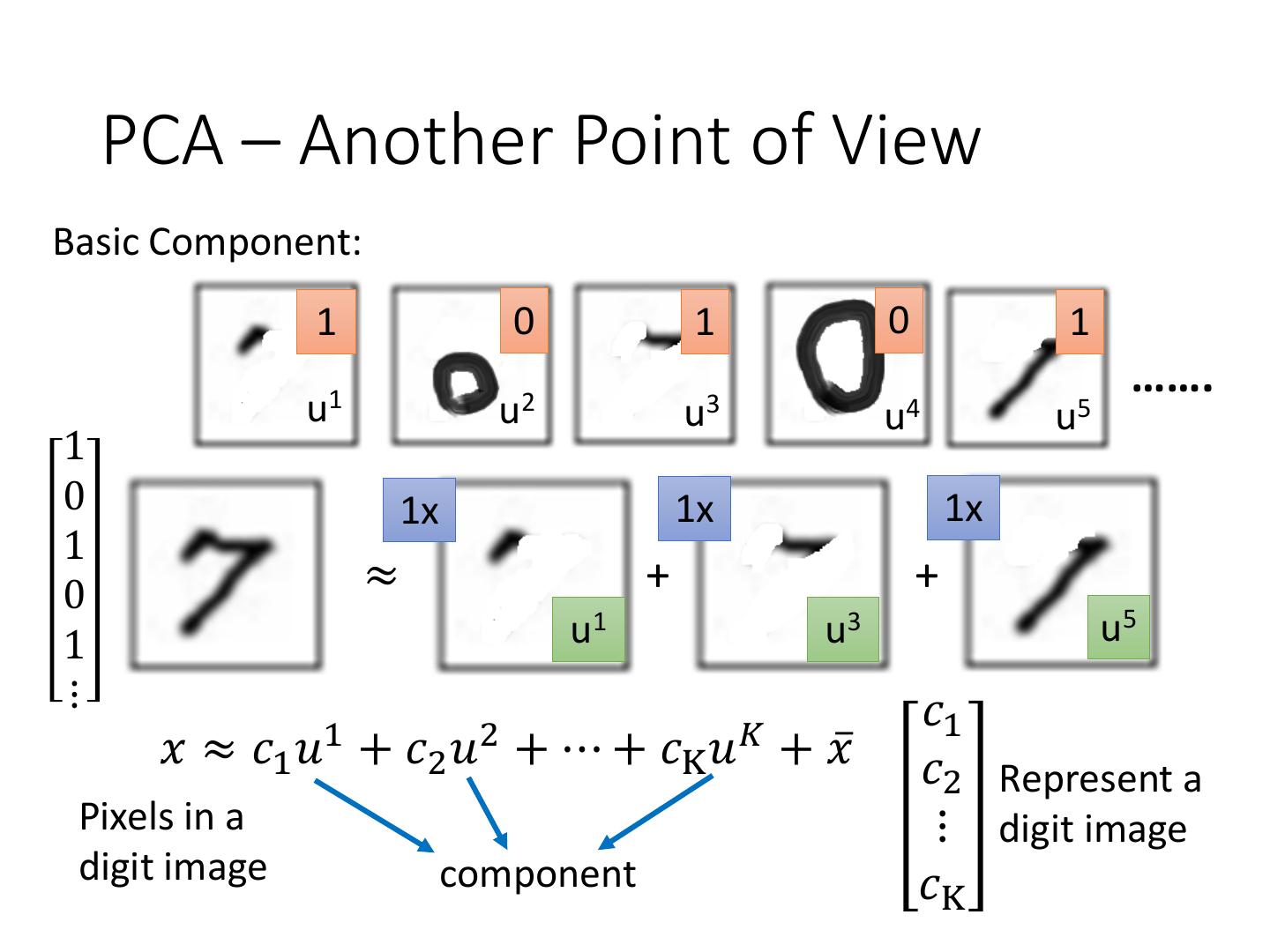 17 . PCA – Another Point of View Basic Component: 1 0 1 0 1 ……. u1 u2 u3 u4 u5 1 0 1x 1x 1x 1 0 ≈ + + 1 u1 u3 u5 ⋮ 𝑐1 1 2 𝐾 𝑥 ≈ 𝑐1 𝑢 + 𝑐2 𝑢 + ⋯ + 𝑐K 𝑢 + 𝑥ҧ 𝑐2 Represent a Pixels in a ⋮ digit image digit image component 𝑐K